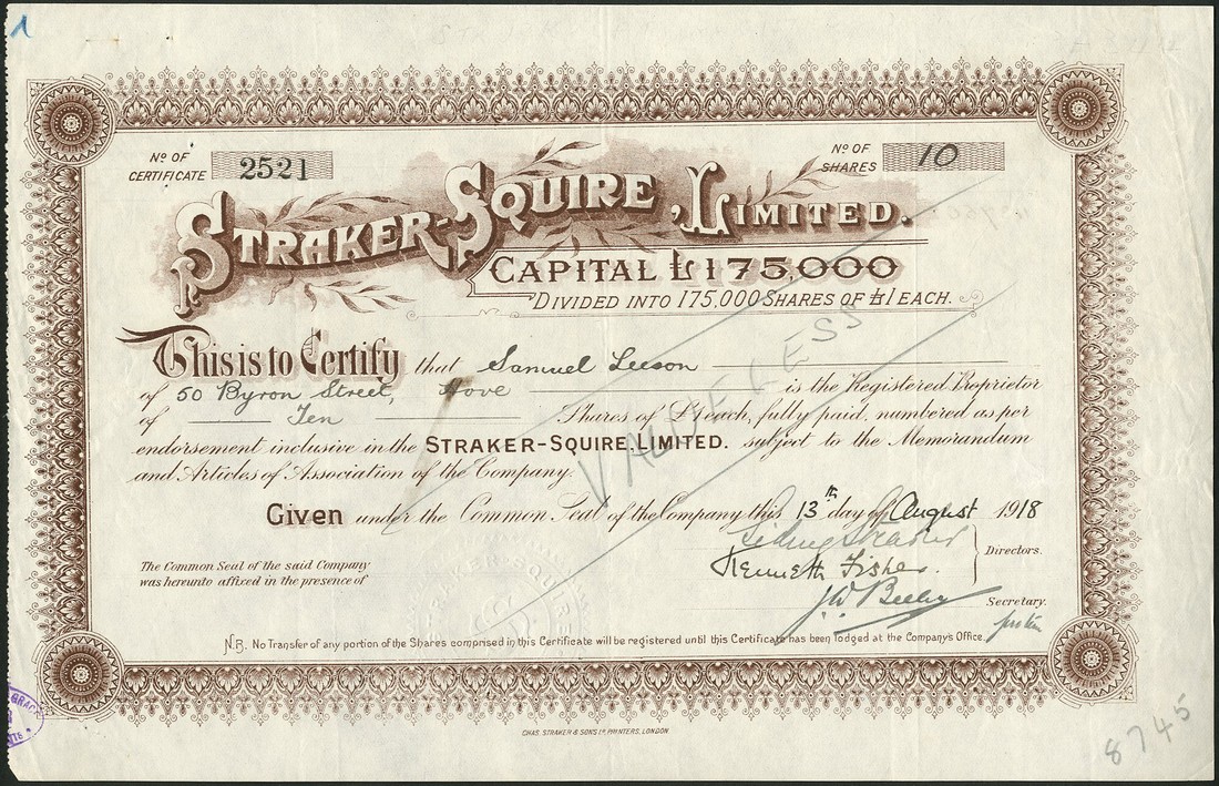 Straker-Squire Ltd., a group of 6 certificates comprising; £1 shares, 19[18], no.2521, capital £175,000, decorative border, brown; 5 shilling shares, 19[21], no.7365, capital £200,000, decorative border, mauve; £1 shares, 19[19], no.4000, capital £500,000, decorative border, blue; 5 shilling preferred ordinary shares, 19[25], no.438, decorative title, embossed seal, black; 1 shilling proprietors shares, 19[25], no.438, both with capital £420,000, decorative title, embossed seal, red; second mortgage debenture stock certificate, 19[21], no.533, scrollwork at left, black, pink underprint, generally very fine and better. (6)