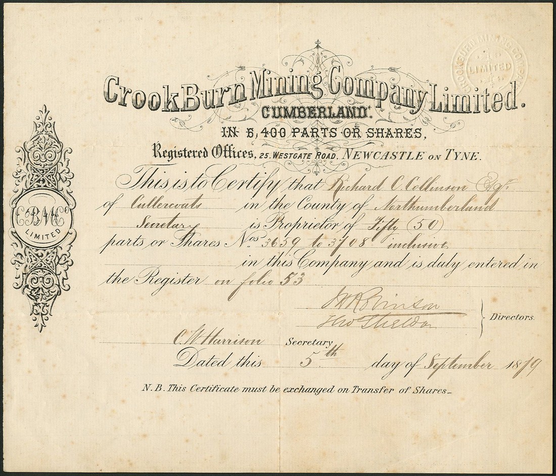 A good group of North of England metal mining companies (7), comprising Crookburn Mining Company Ltd., certificate of ordinary shares, 18[79], no.3659-3708, scrollwork at left, a little foxing; Borrowdale Plumbago Mines & Manufacturing Company Ltd., £1 shares, 18[88], no.372; Winnie Mine Company Ltd., £1 shares, 18[93], no.51; Healeyfield Mining Company Ltd., certificate of shares, 18[88], no.20188-20207, this in poor condition; Victory Lebel, Burnt Heath and Water Grove Mining Company, one share, 1857, no.936; Gamblesby Fell Mining Company, certificate of shares, 185[3], no.3931 to 3940, and, Ulverston Mining Company Ltd., one share of £20, 1873, no.2170, very fine to extremely fine unless stated. (7)