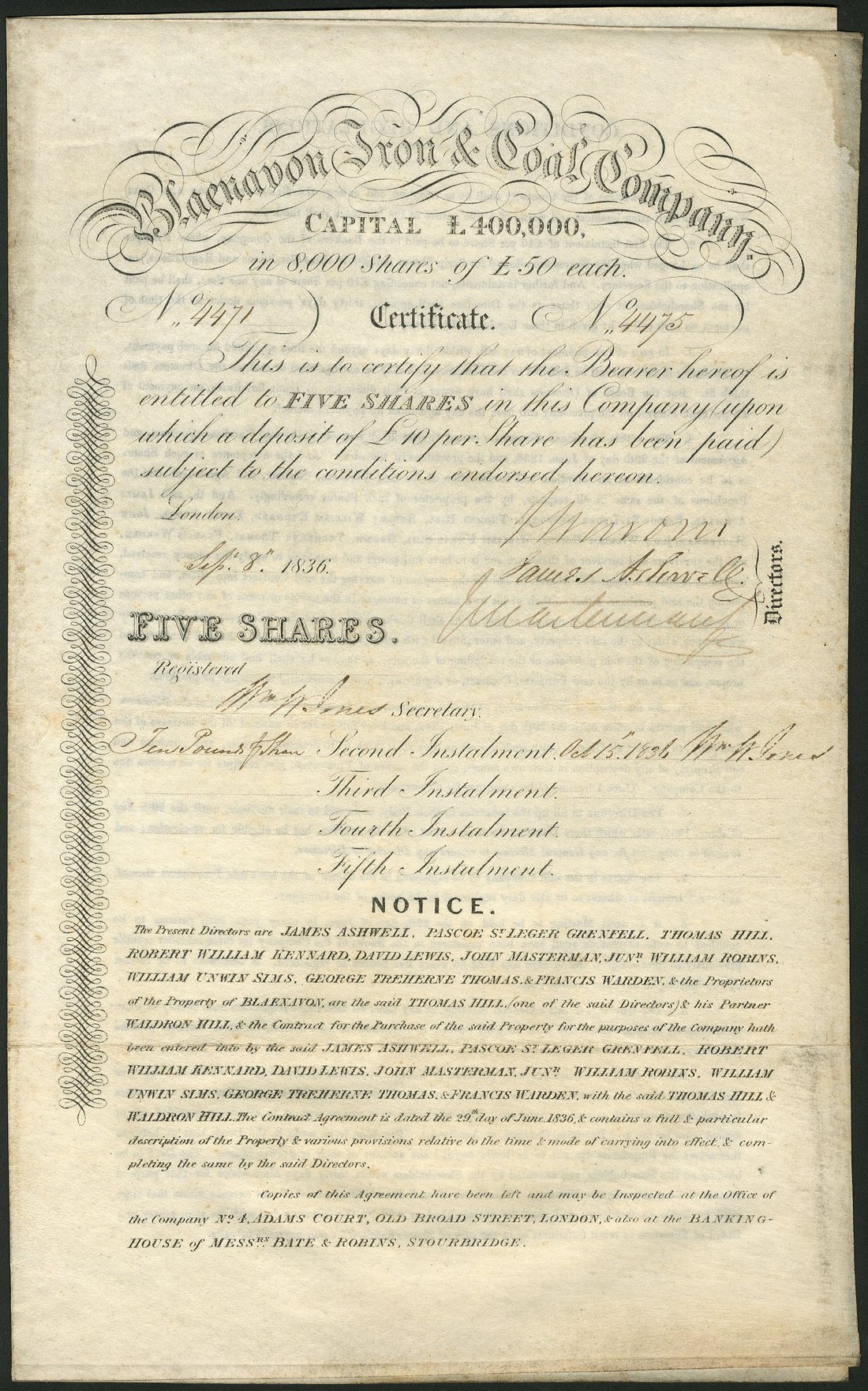 Blaenavon Iron & Coal Company, certificate to bearer for 5 shares of £50 each, 1836, no.4471-4475, decorative title, black, printed on vellum, 4 pages with condition printed on the reverse of page 2, slight discolouration, otherwise very fine and scarce.