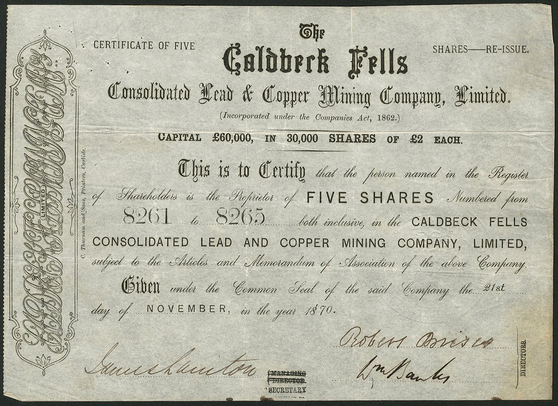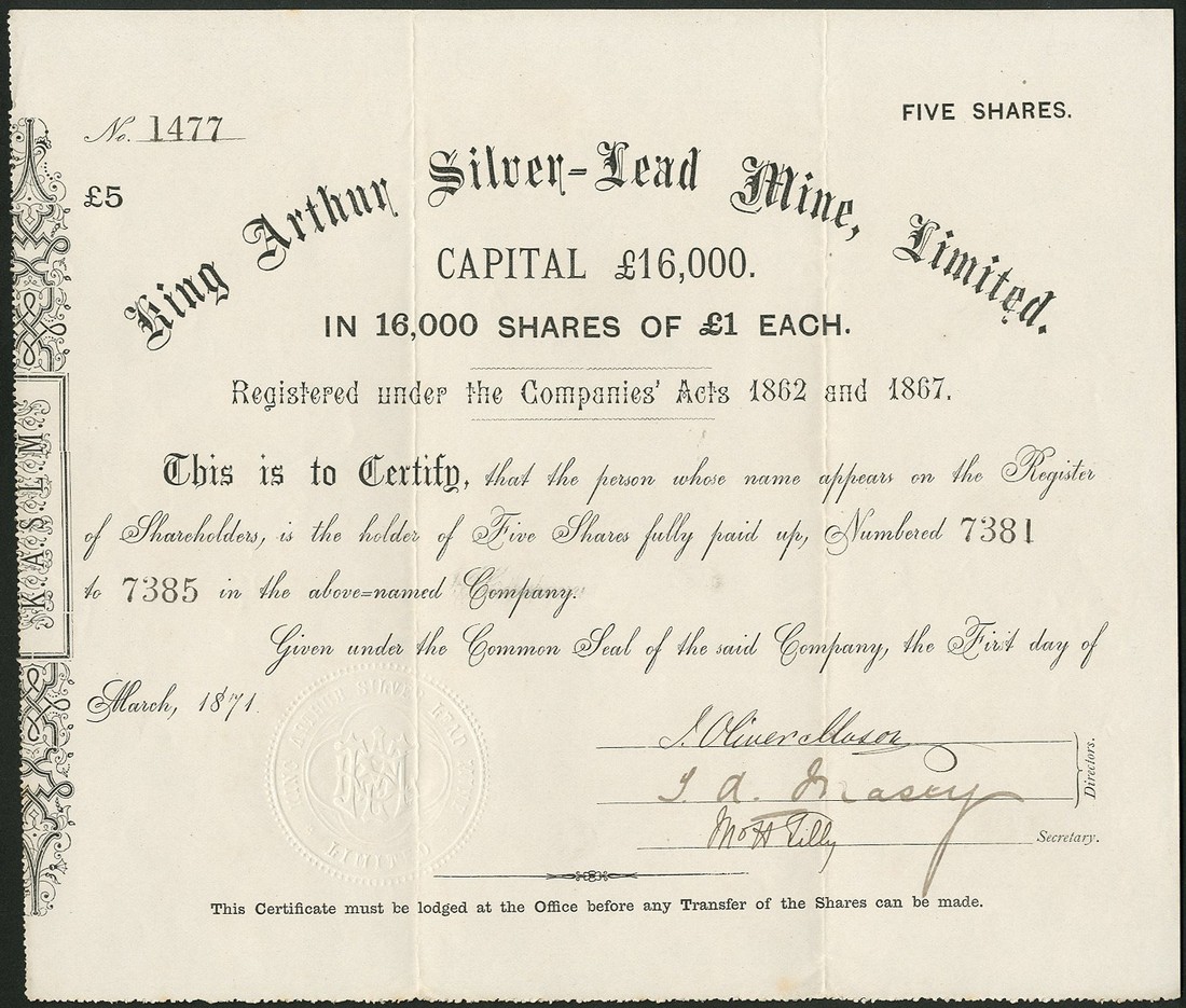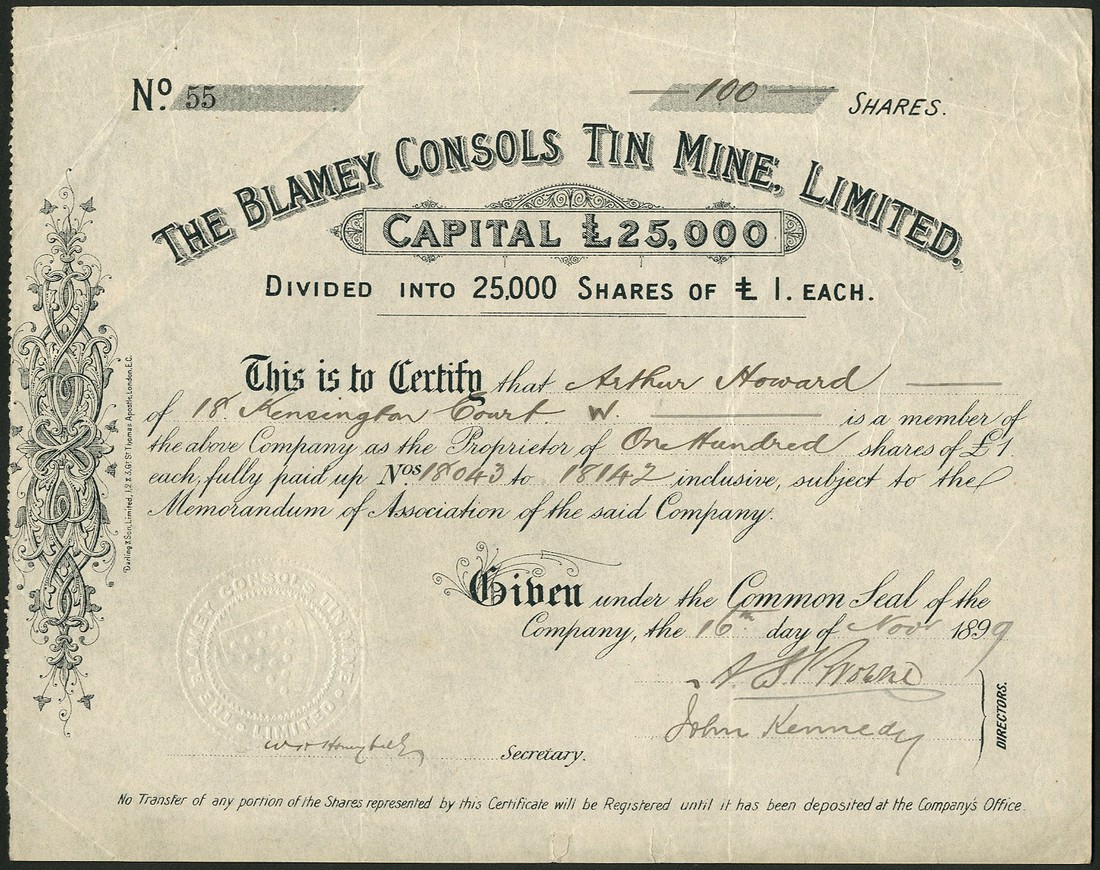 Blamey Consols Tin Mine Ltd., certificate for £1 shares, 189[9], no.55, scrollwork at left, black, together with 6 more British mining certificates comprising; King Arthur Silver-Lead Mine Ltd., 5 £1 shares, 1871, no.1477, Glan Clwyd Lead Mining Co. Ltd., two pieces, £1 shares, 187[5], no.154 and 155, Caldbeck Fells Consolidated Lead & Copper Mining Co. Ltd., three pieces, two certificates for re-issued shares of £2 each, 1870, no.8261-8265 and 26076-26080, and certificate for 10% redeemable debenture stock, 18[75], no.25, generally very fine. (7)