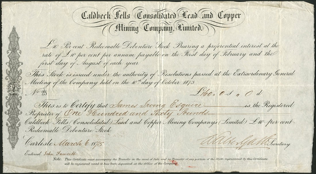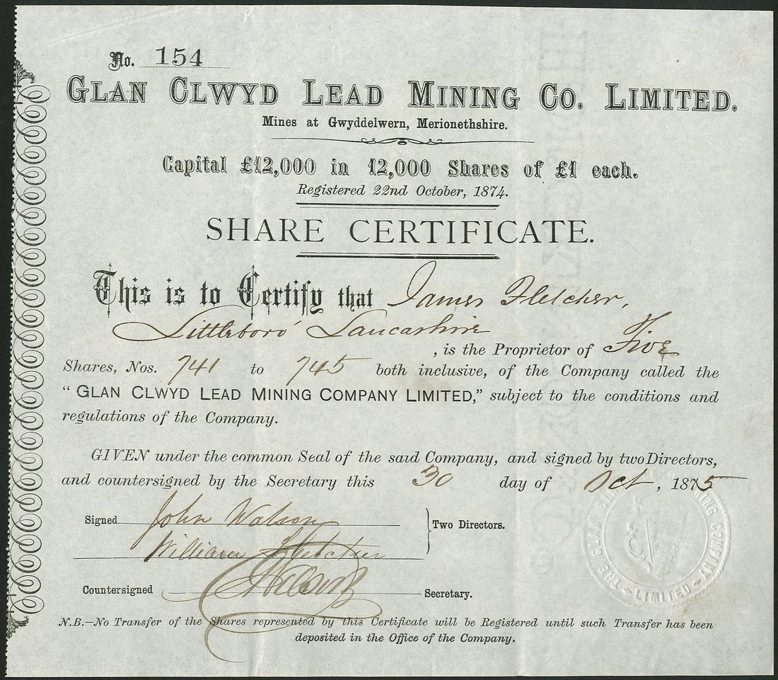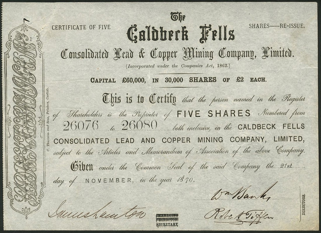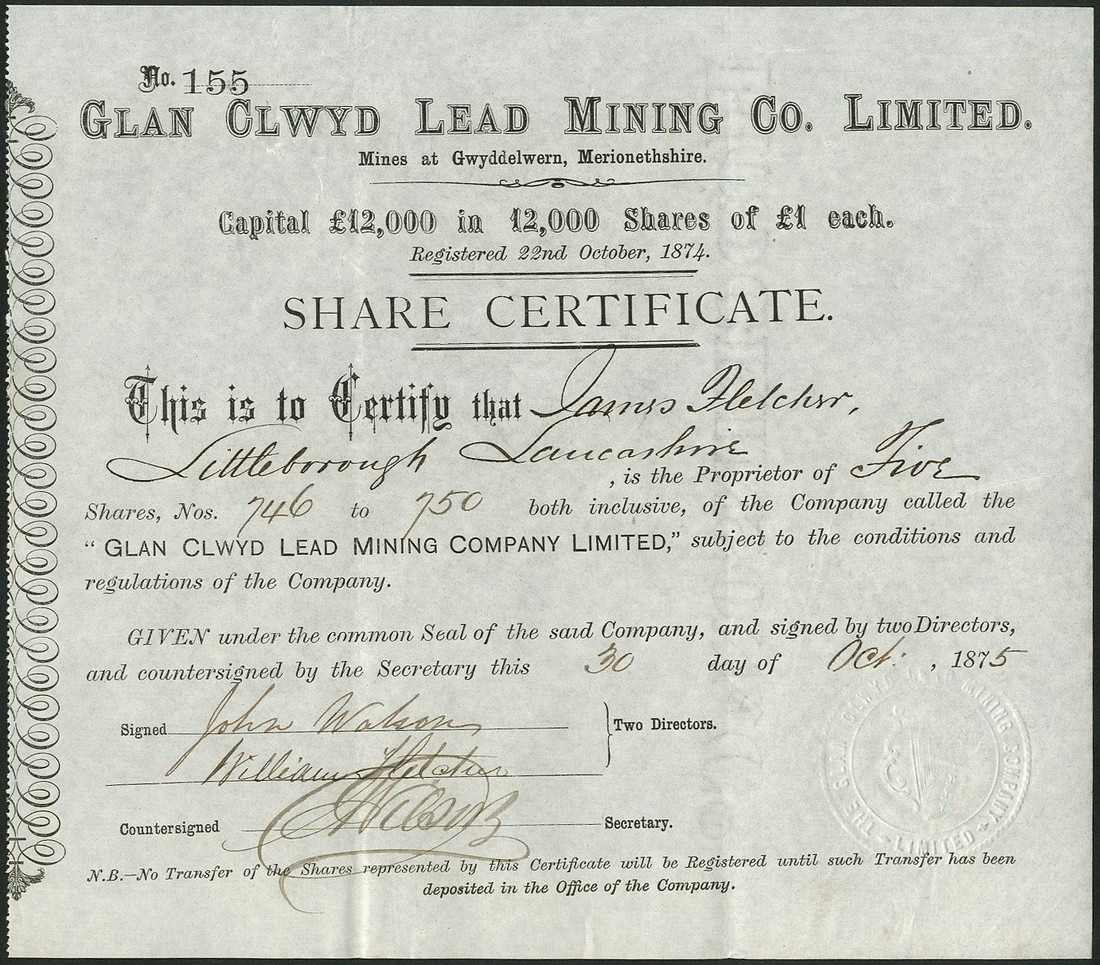 Blamey Consols Tin Mine Ltd., certificate for £1 shares, 189[9], no.55, scrollwork at left, black, together with 6 more British mining certificates comprising; King Arthur Silver-Lead Mine Ltd., 5 £1 shares, 1871, no.1477, Glan Clwyd Lead Mining Co. Ltd., two pieces, £1 shares, 187[5], no.154 and 155, Caldbeck Fells Consolidated Lead & Copper Mining Co. Ltd., three pieces, two certificates for re-issued shares of £2 each, 1870, no.8261-8265 and 26076-26080, and certificate for 10% redeemable debenture stock, 18[75], no.25, generally very fine. (7)