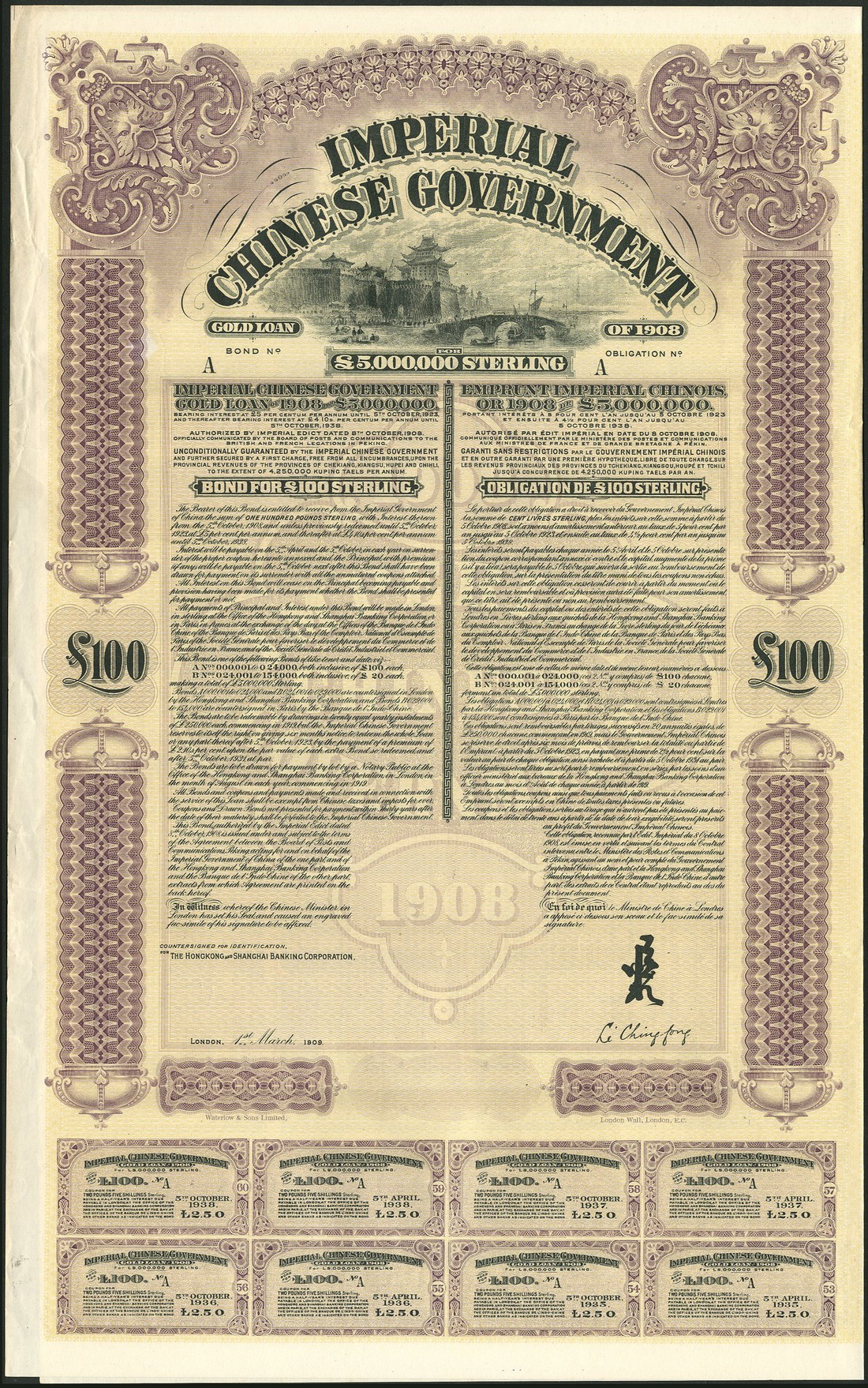 1908 5%/4½% Gold Loan, unissued bond for £100, Hongkong and Shanghai Banking Corporation, walled city at top, mauve and black, printed by Waterlow & Sons, with full coupons attached at bottom and to right, not numbered, slightly creased at left edge, about extremely fine and extremely rare.