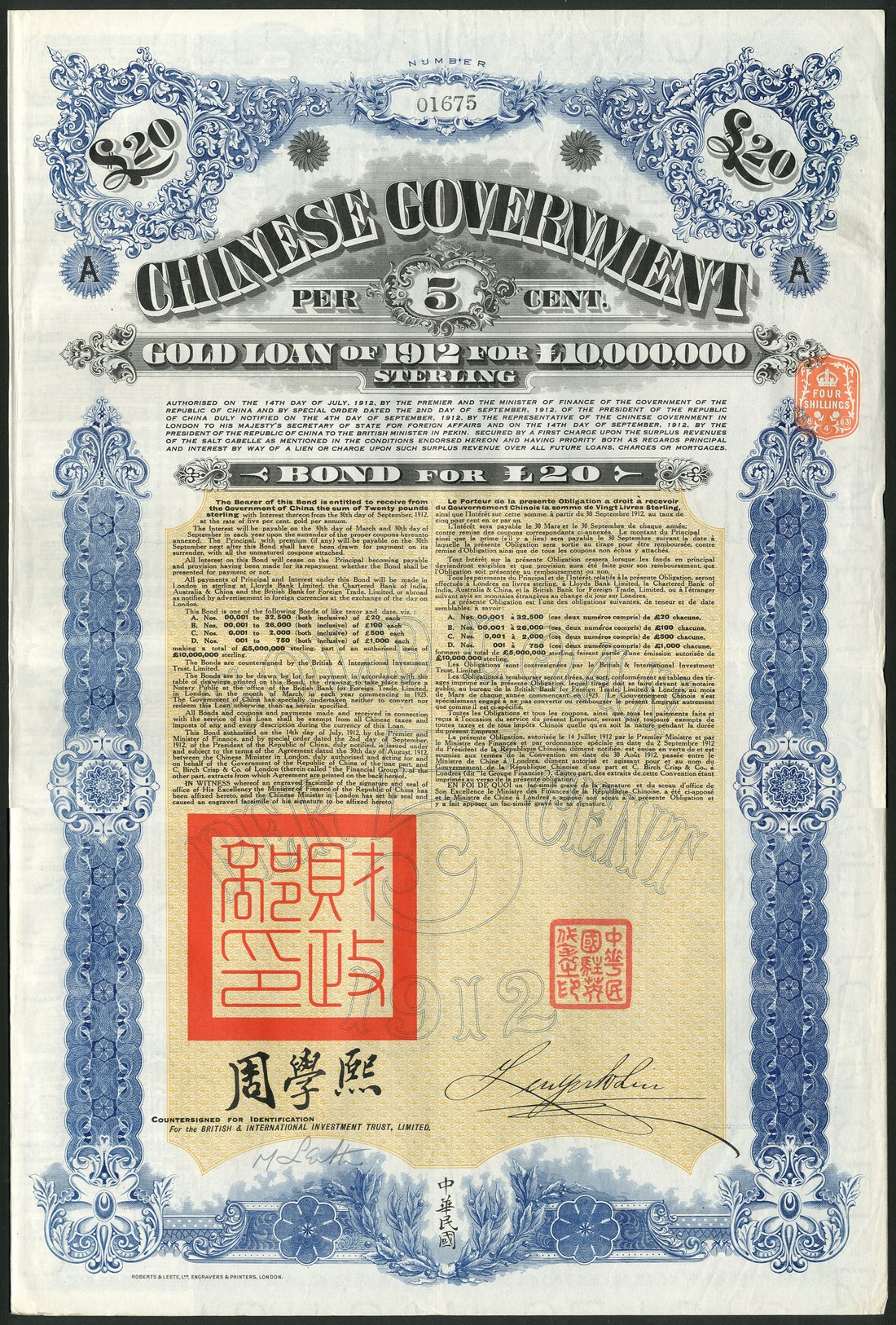 1912, 5% 'Crisp' Gold Loan, a group of 25 bonds for £20, large format, ornate borders, blue and black with yellow underprint, with coupons, a better than average lot, good very fine to extremely fine. (25)