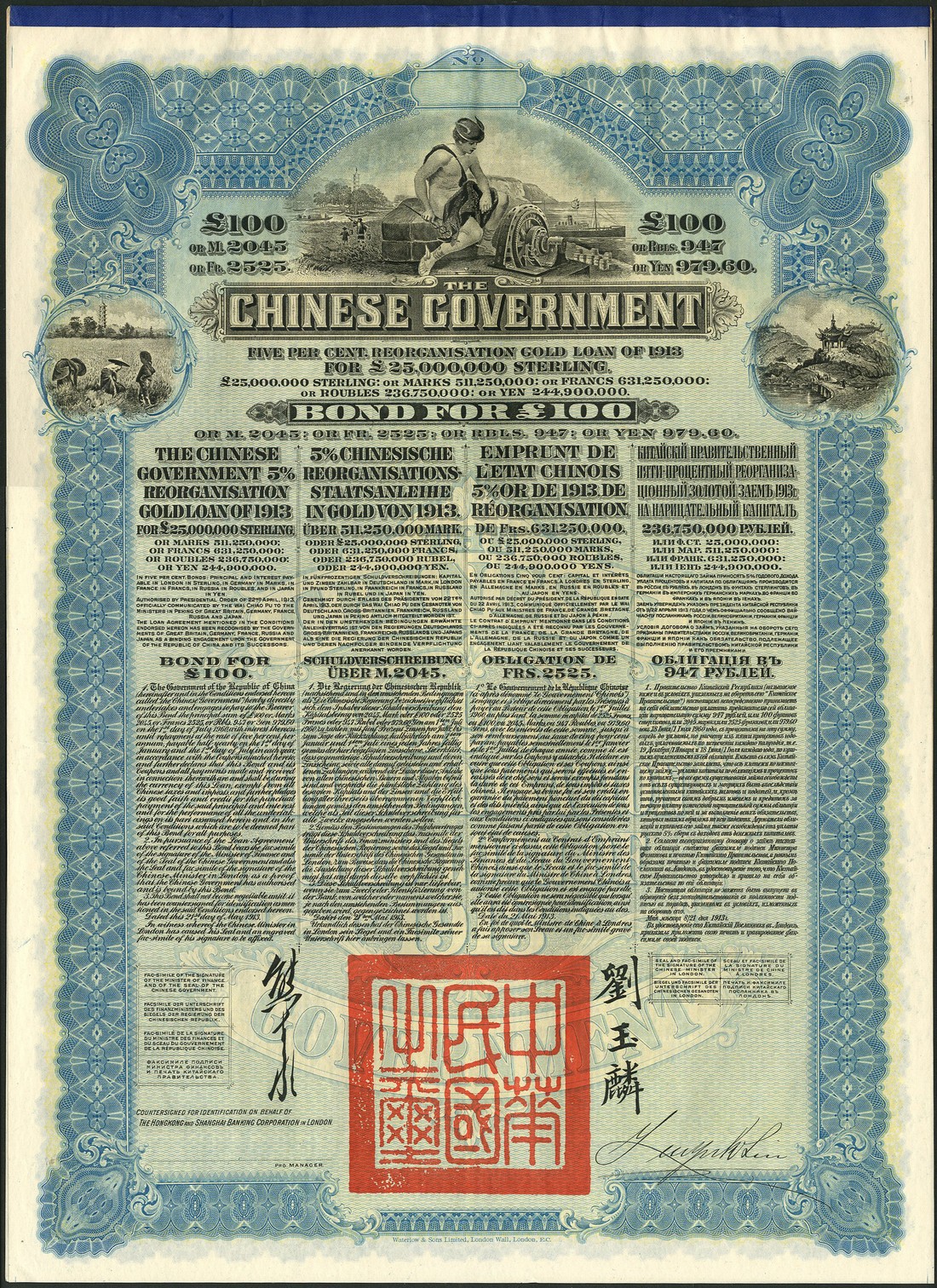 1913 5% Reorganisation Gold Loan, unissued bond for £100, Hongkong and Shanghai Banking Corporation, 'Mercury' at top, peasants and buildings at either side, blue and black, printed by Waterlow & Sons, with full coupon sheets, not numbered, extremely fine and extremely rare.