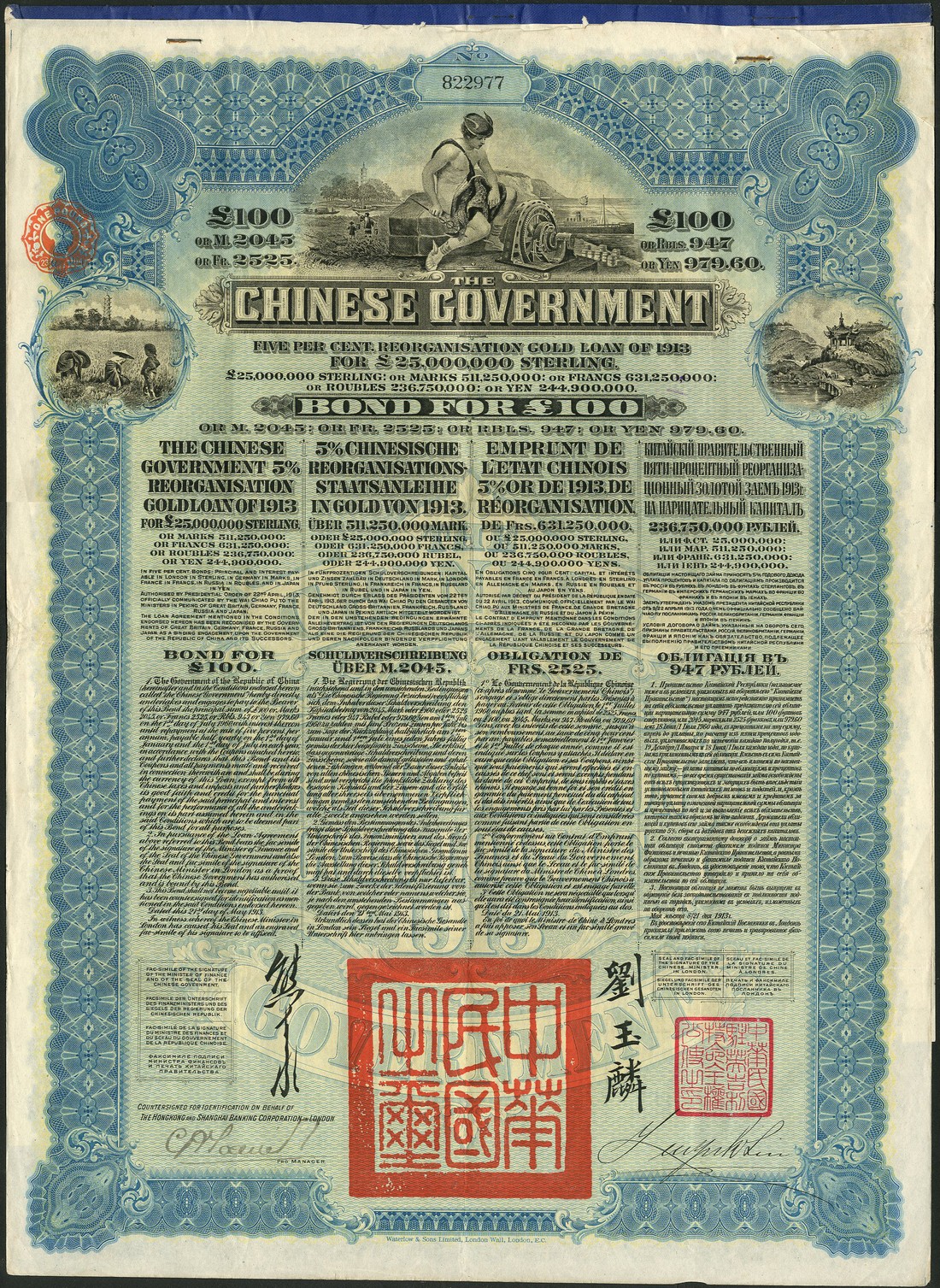1913 5% Reorganisation Gold Loan, 3 bonds for £100, issued by the Hongkong and Shanghai Banking Corporation, 'Mercury' at top, peasants and buildings at either side, blue and black, printed by Waterlow & Sons Ltd., with coupons, fine to very fine. (3)