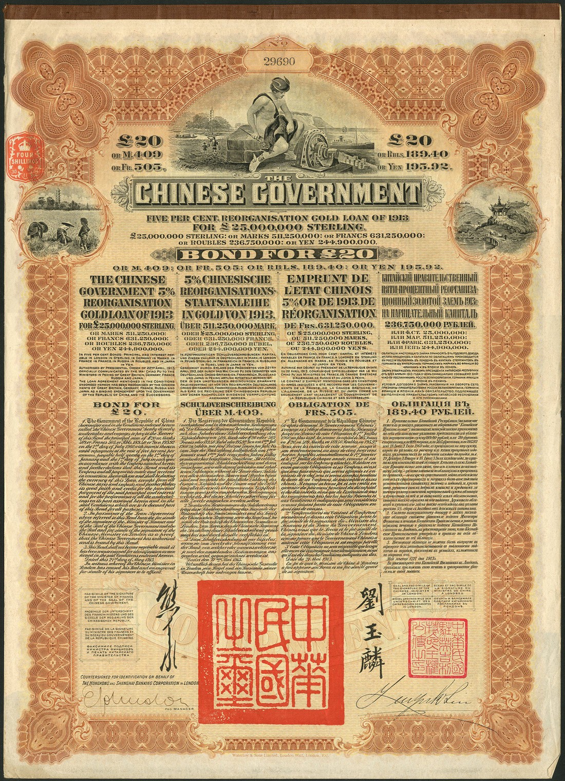 1913 5% Reorganisation Gold Loan, a group of 16 bonds for £20, 8 are countersigned by the Hongkong and Shanghai Banking Corporation, 4 by Banque de L'Indo-Chine, 2 by Deutsch-Asiatische Bank and 3 by the Russo Asiatic Bank, 'Mercury' at top, peasants and buildings at either side, brown and black, printed by Waterlow & Sons, with coupons, very fine to extremely fine. (16)