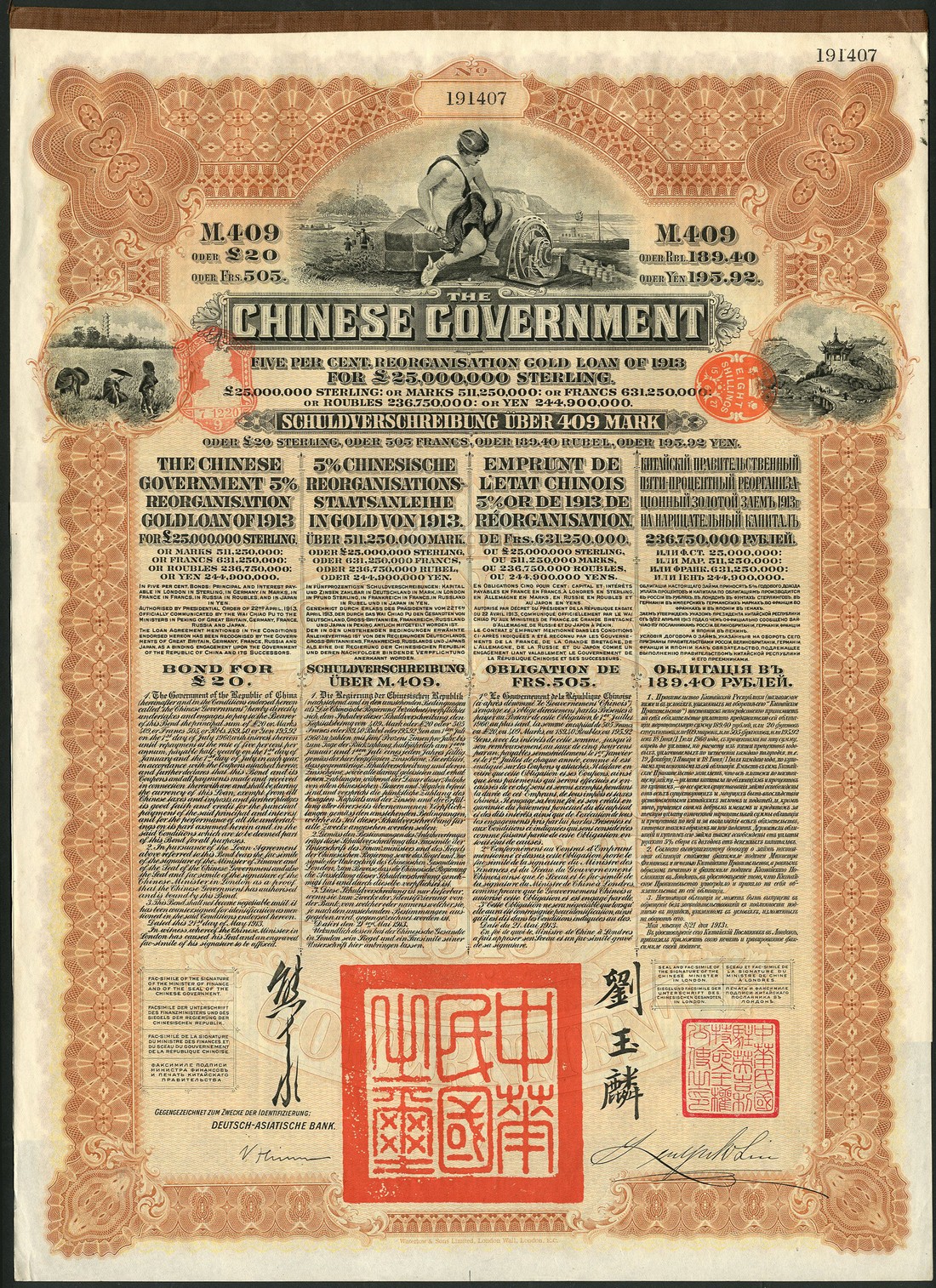 1913 5% Reorganisation Gold Loan, a group of 20 bonds for £20, issued by Deutsch-Asiatische Bank, 'Mercury' at top, peasants and buildings at either side, brown and black, printed by Waterlow & Sons, with coupons, very fine and better. (20)