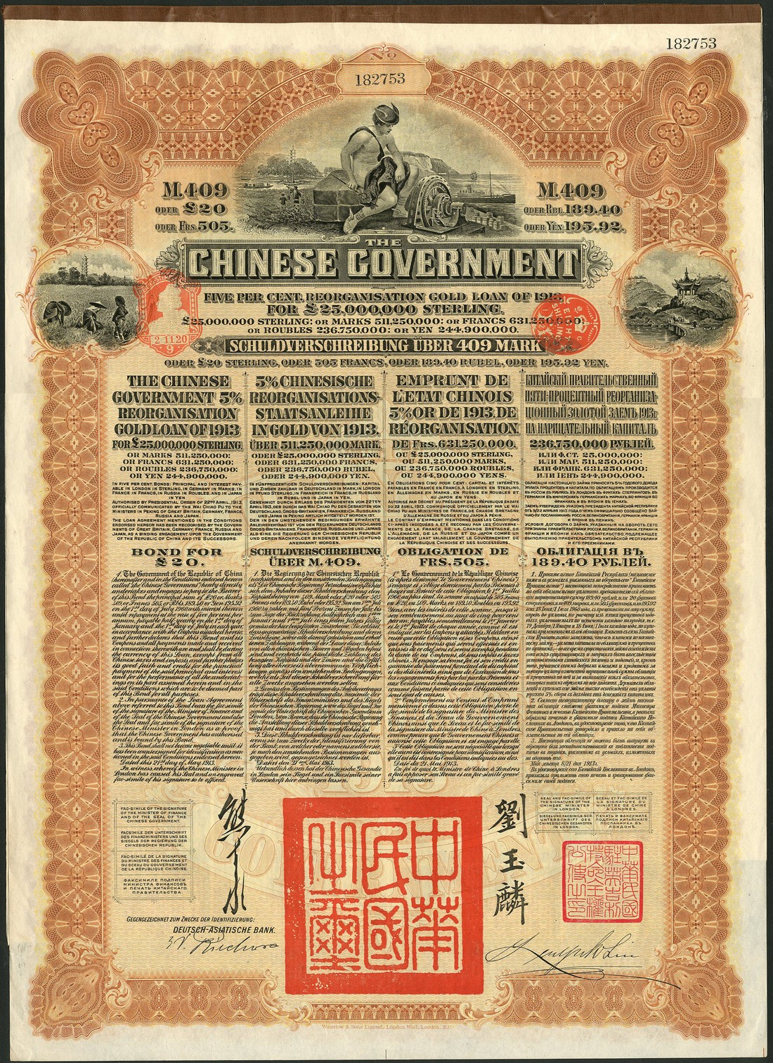 1913 5% Reorganisation Gold Loan, a group of 23 bonds for £20, issued by Deutsch-Asiatische Bank, 'Mercury' at top, peasants and buildings at either side, brown and black, printed by Waterlow & Sons, with coupons, very fine and better. (23)
