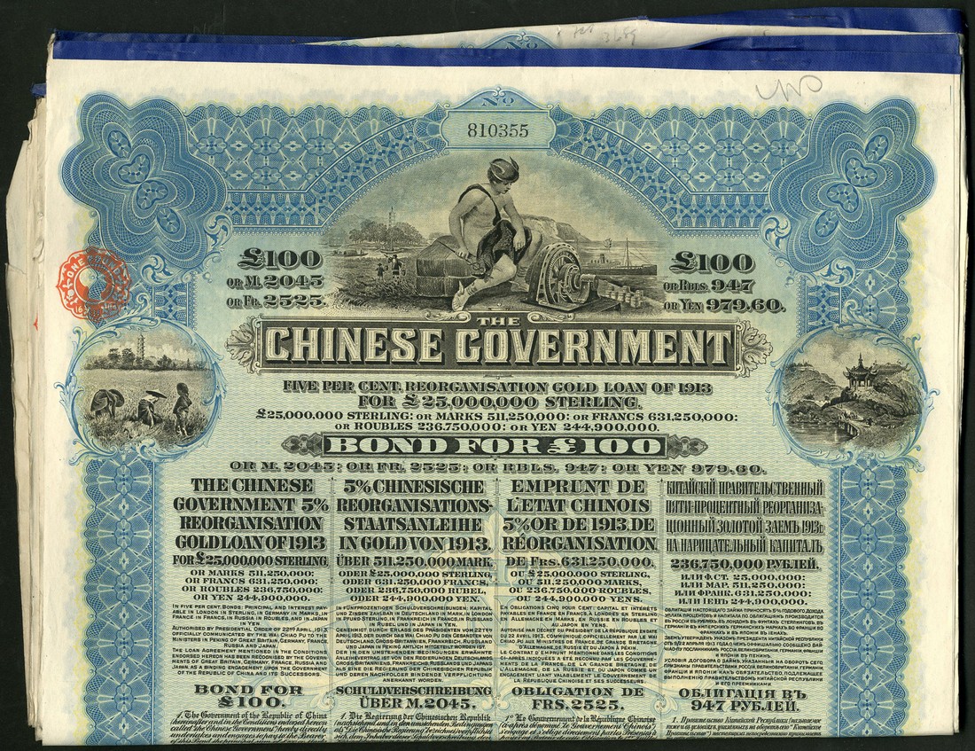 1913 5% Reorganisation Gold Loan, a group of 10 bonds for £100, issued by the Hongkong & Shanghai Banking Corporation, 'Mercury' at top, peasants and buildings at either side, blue and black, printed by Waterlow & Sons, with coupons, mixed condition, many very fine. (10)