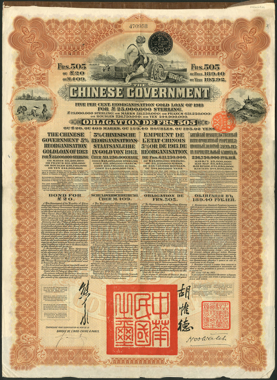 1913 5% Reorganisation Gold Loan, a group of 20 bonds for £20, issued by the Banque de Lindo-Chine, 'Mercury' at top, peasants and buildings at either side, brown and black, printed by Waterlow & Sons, with coupons, generally very fine and better. (20)