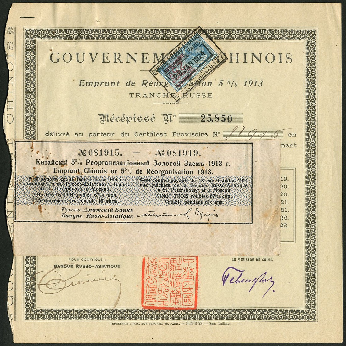 1913 5% Reorganisation Gold Loan, a group of 5 receipts for repayment of coupon payable 1914, attached to original coupon for 5 bonds numbered 081915-081919, small format, black on pale green paper, french adhesive duty stamps, red 'chop' at bottom, very fine and very rare with original coupon.