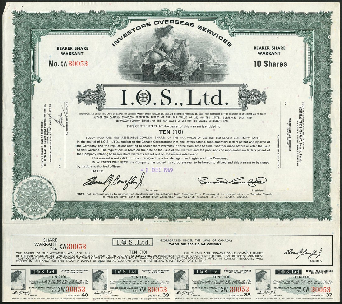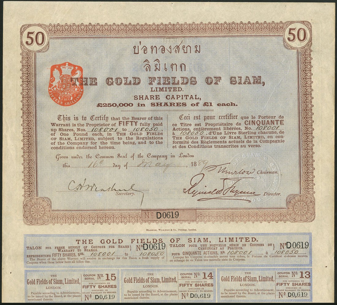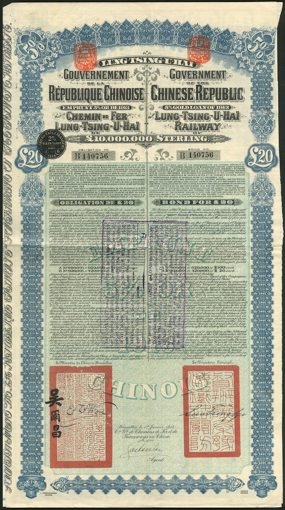Lung Tsing U Hai Railway, 5% Gold Loan of 1913, bond for £20, no. B140756, large format, blue and black, with coupons; together with Gold Fields of Siam Ltd., 50 shares of £1, 18[89], brown with blue underprint, with coupons, and I.O.S. Ltd., 10 shares, 1969, green and black, with coupons, generally very fine or better. (3)