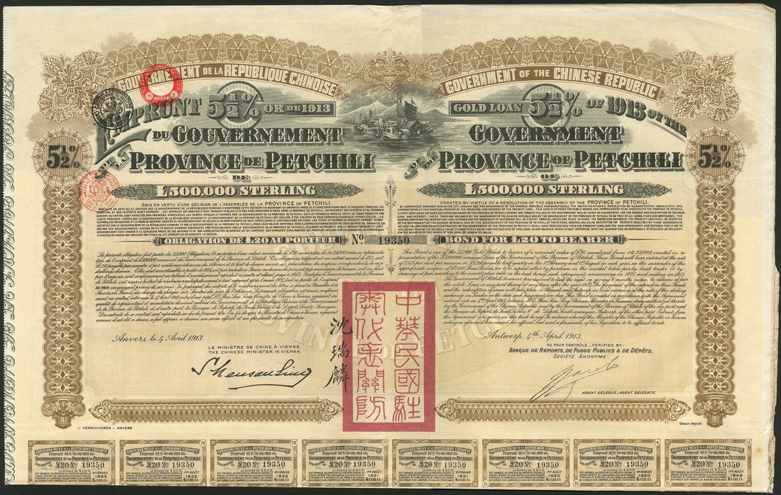 Province of Petchili, 5½% Gold Loan of 1913, bond for £20, no.19350, very large format piece with vignette of Chinese shipping with mountains in background, brown and black, red 'chop' in centre, text in French and English, with coupons, about good very fine, slightly rough right edge.