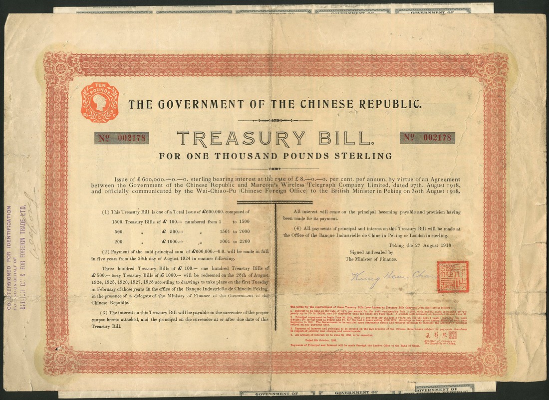1918, 8% 'Marconi' Treasury Bill, £1000 bond, no.2178, of only 200 issued, ornate border, red and black, yellow underprint, new coupons re-attached, minor edge splits, very fine for the issue and very rare thus.