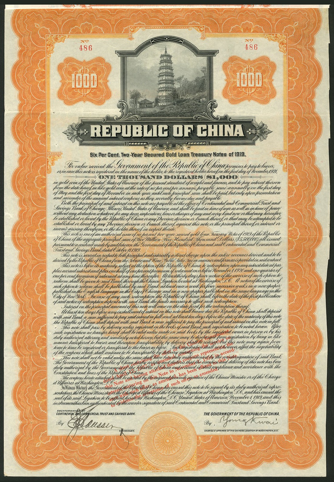 1919, 6% Two-Year Secured Gold 'Chicago Bank' Loan, $1000 bond, no.486, vignette of Pagoda at top, orange and black, printed by the American Bank Note Co., with coupons, almost extremely fine