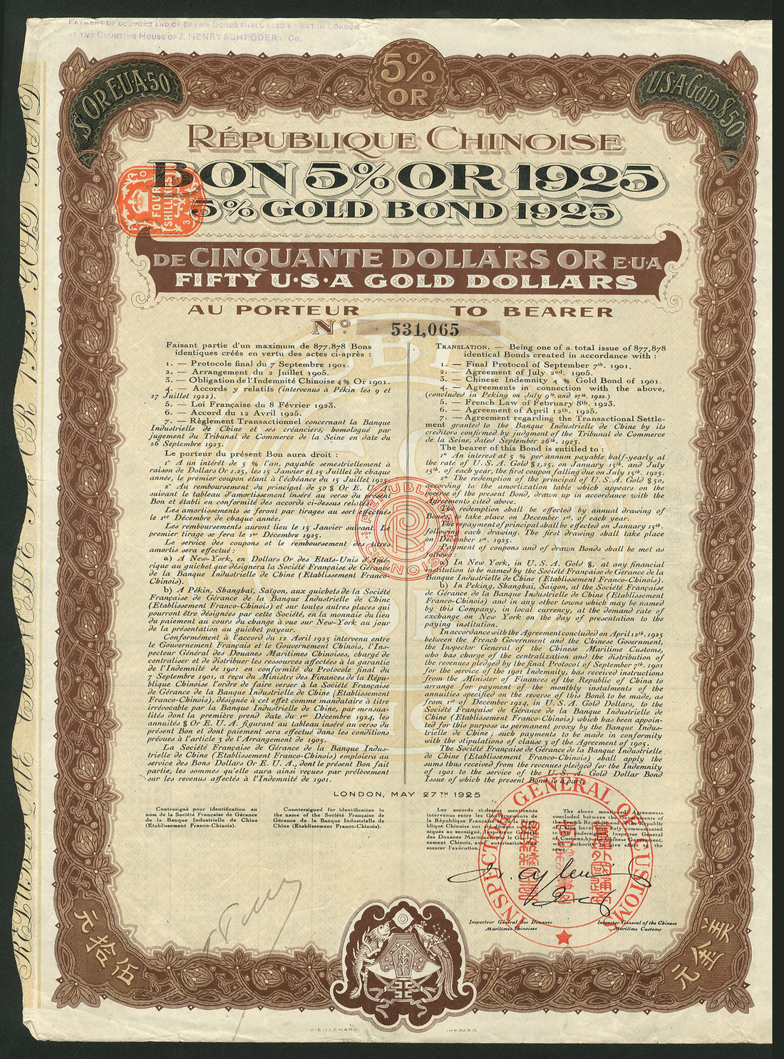 1925 5% Gold 'Boxer' Loan, a group of 100 bonds for $50US, ornate border, brown, yellow underprint, text in English and French, with coupons, generally very fine to extremely fine. (100)