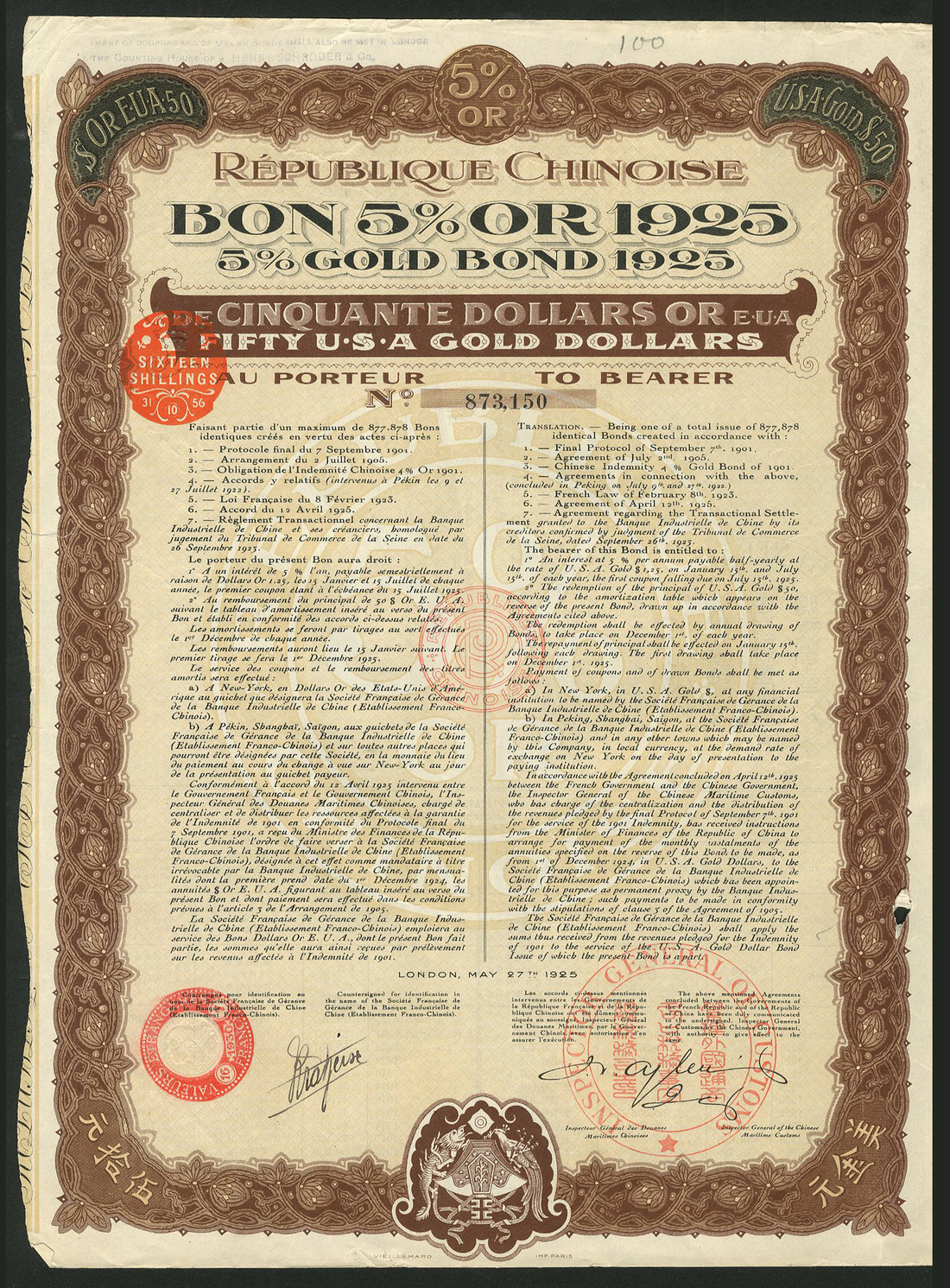 1925 5% Gold 'Boxer' Loan, a group of 100 bonds for $50US, ornate border, brown, yellow underprint, text in English and French, with coupons, generally very fine to extremely fine. (100)