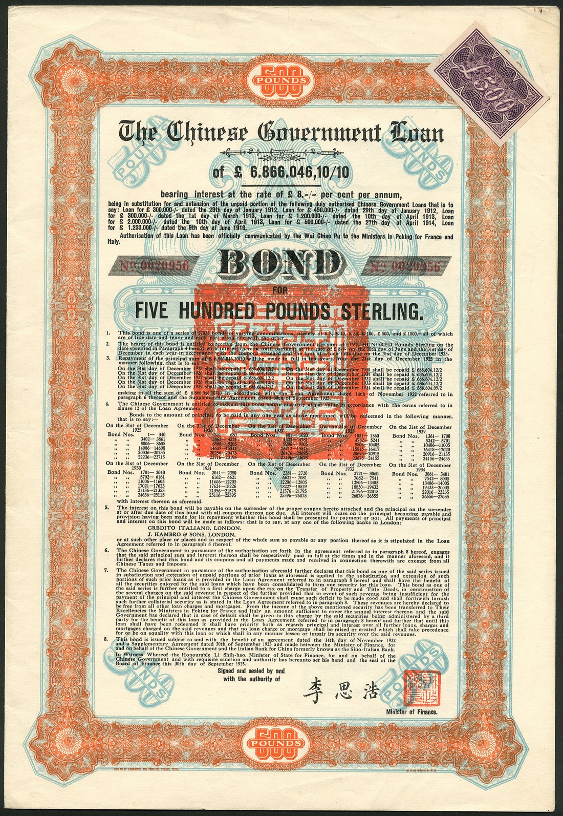 1925 8% 'Skoda' Loan, bond for £500, no.0020956, ornate border, orange and black, 'chop' in centre, with coupons, about extremely fine.