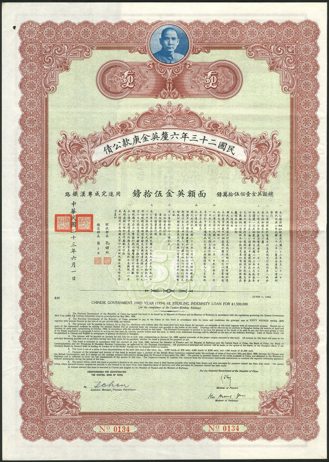 1934 6% Sterling Indemnity (Boxer) Loan, bond for £50, no.0134, ornate border with vignette of Sun Yat Sen at top, blue, brown and black with green underprint, with coupons, spike hole at top left, good very fine.