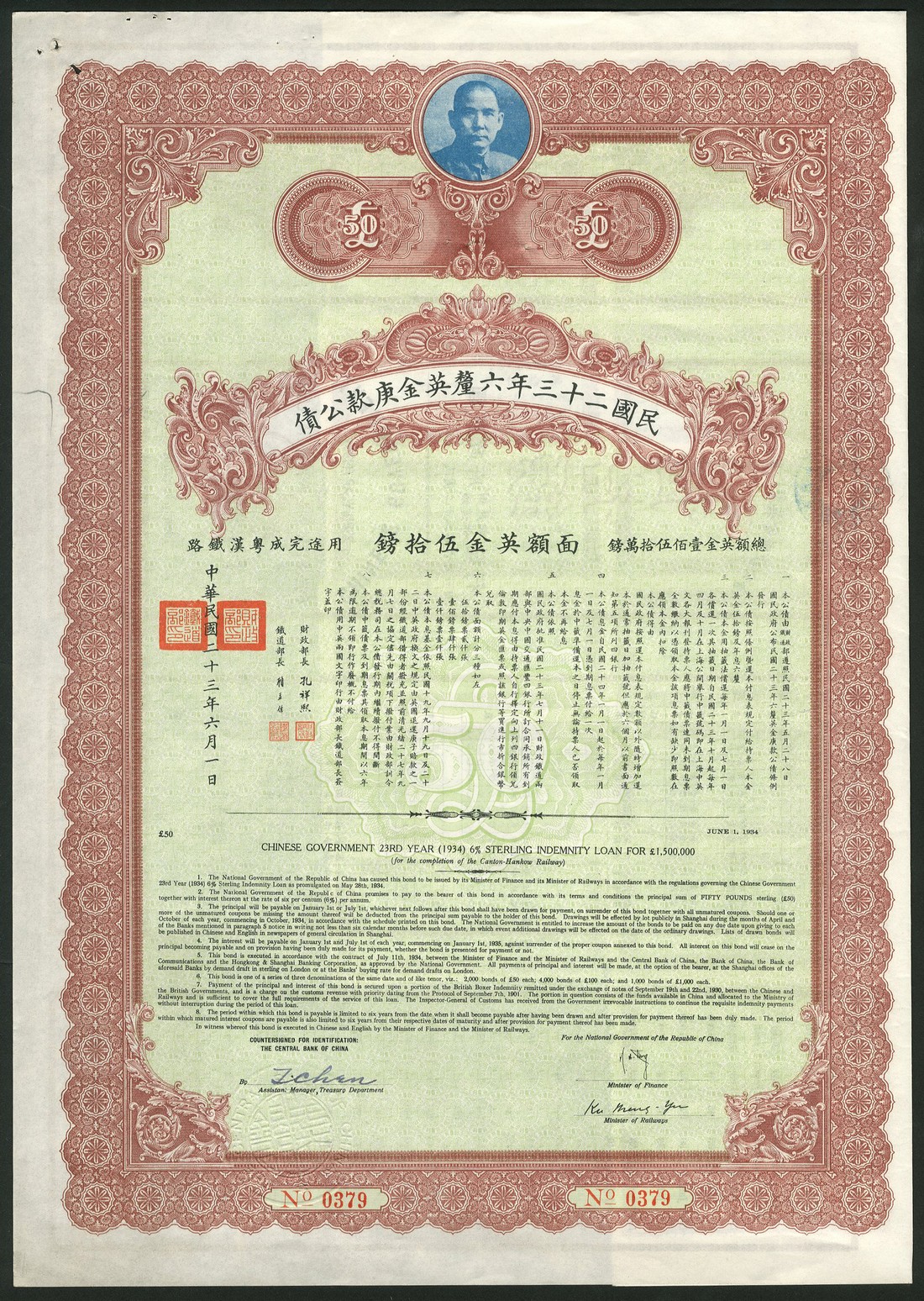 1934 6% Sterling Indemnity Loan, bond for £50, no.0379, vignette of Sun Yat Sen at top, brown and blue, green underprint, with coupons, extremely fine