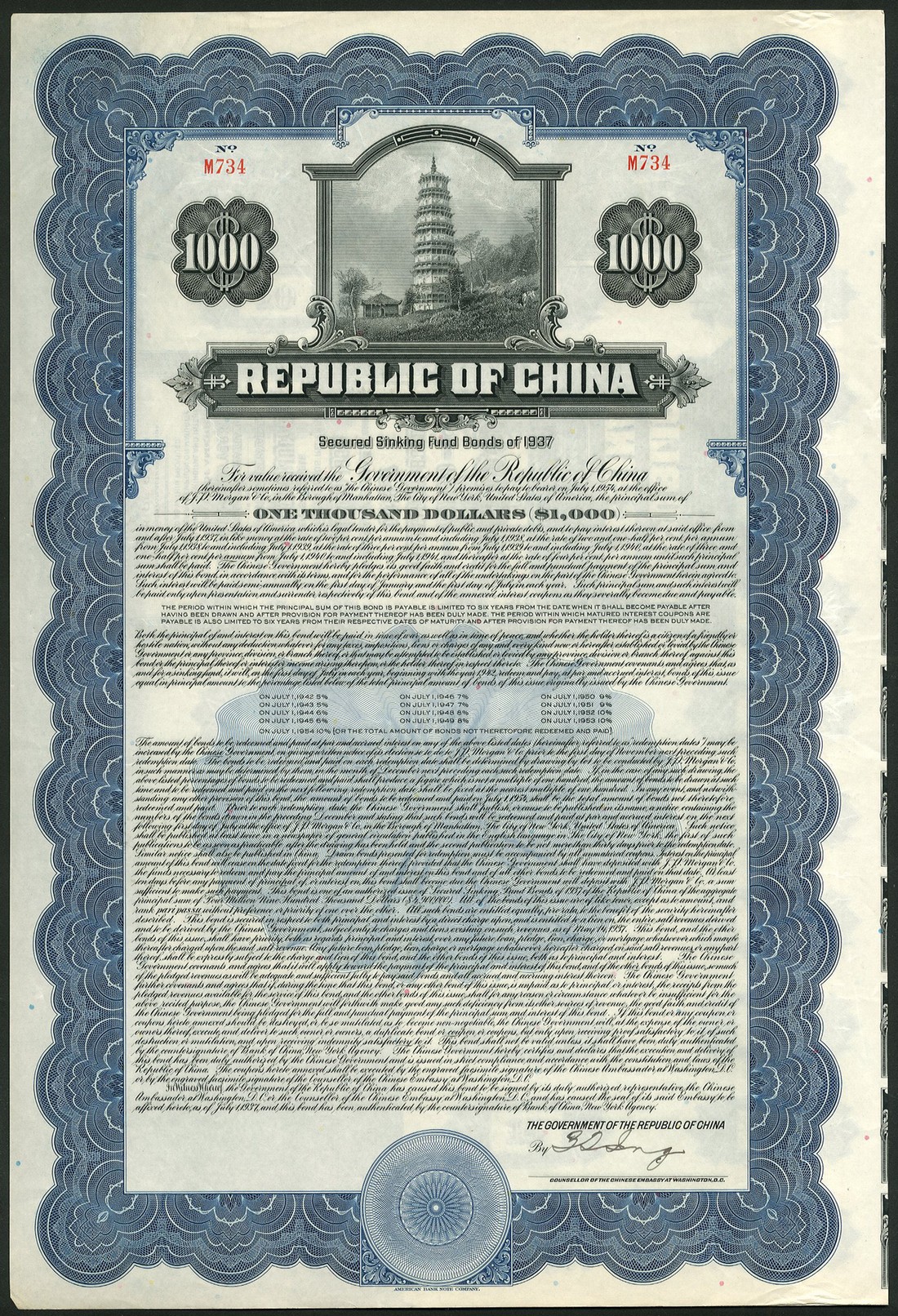 1937 Secured Sinking Fund Bond (Pacific Development Loan), for US$1000, no.M734, pagoda at top, blue and black, with coupons, ABNCo. printing, with certificate attached to denote American domicile, extremely fine.