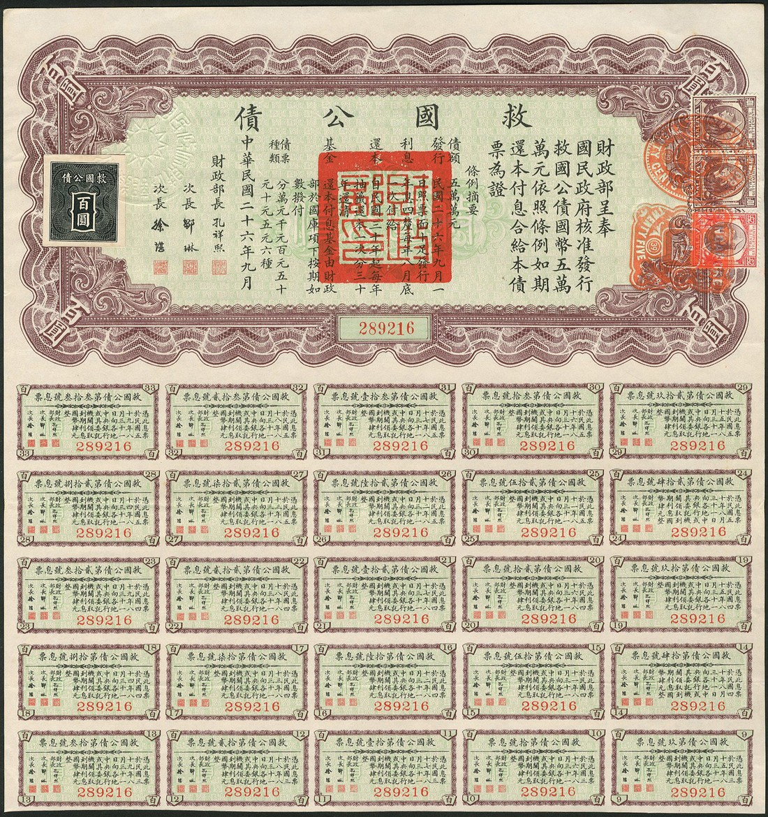1937, 4% Liberty Loan, bond for $100, no.289216, with adhesive and impressed Singapore revenue stamps added in 1939, ornate border, brown and black, pale green underprint, with coupons, extremely fine and scarce with Singapore revenues