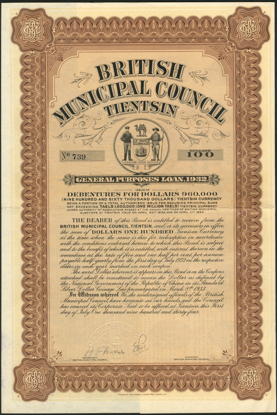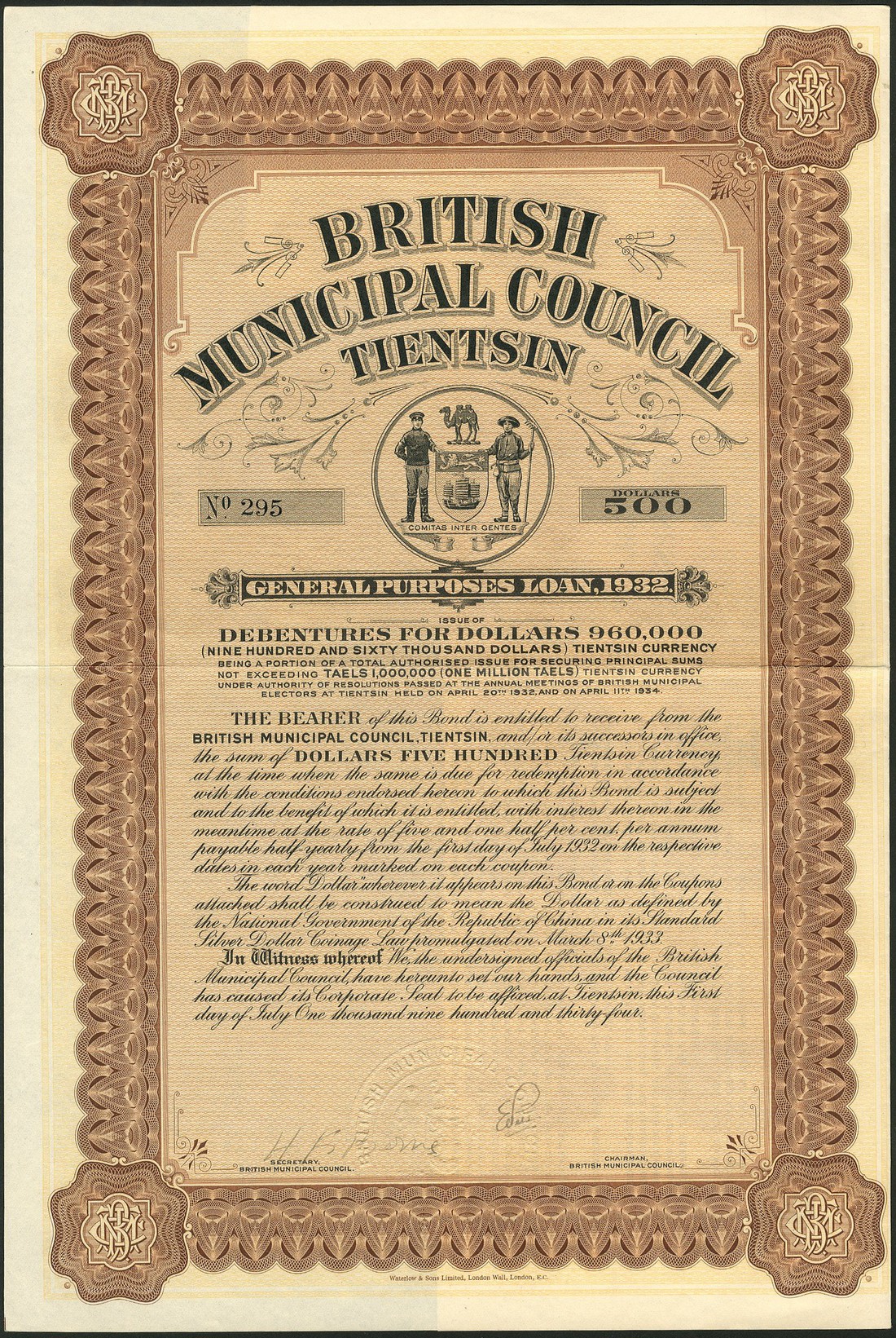 British Municipal Council Tientsin, General Purposes Loan 1932, a set of bonds for $100, $500 and $1000 (Tientsin currency), no.739, 295 and 124, ornate border with coat of arms of the city in centre, brown and black, printed by Waterlow & Sons, all with coupons, all good very fine and a rare set. (3)