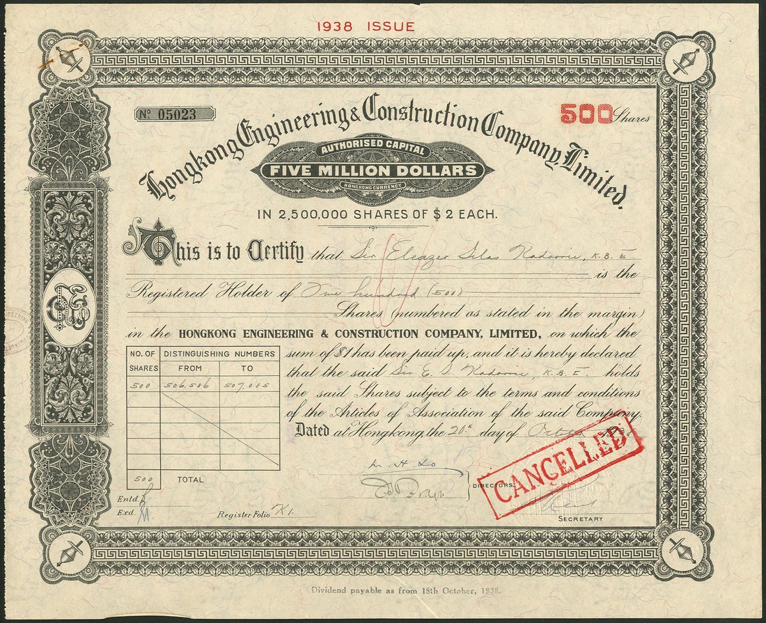 Hongkong Engineering & Construction Co. Ltd., a group of 17 certificates of $2 shares, fully paid, all 19[38], ornate border, black, '1938 ISSUE' in top margin, stamped cancelled in red, generally extremely fine. (17)