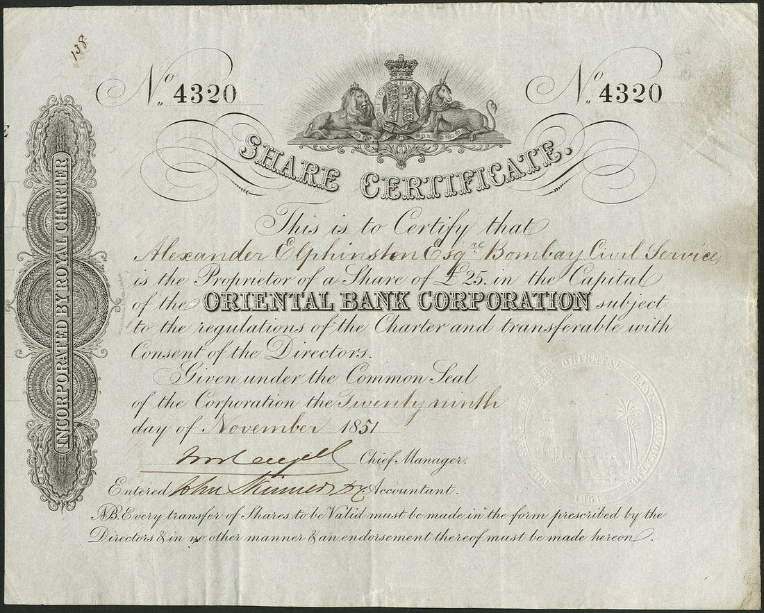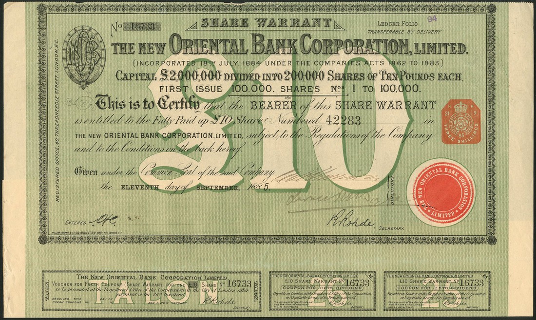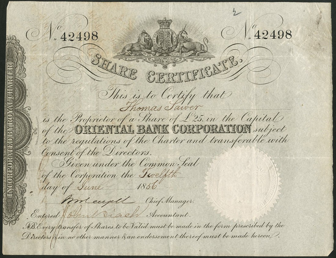 Oriental Bank Corporation, a pair of certificates, each for £25 share, 18[51], no.4320 and 18[56], no.42498, royal coat of arms at top, scrollwork to left, black, together with New Oriental Bank Corporation Ltd., £10 share, 1885, no.16733, black and green, with coupons, very fine. (3)