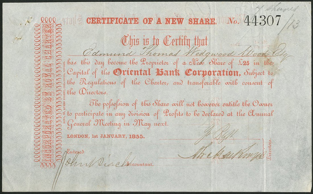 Oriental Bank Corporation, £25 'new' share, London 1855, no.44307, small format piece, red, very fine and scarce type