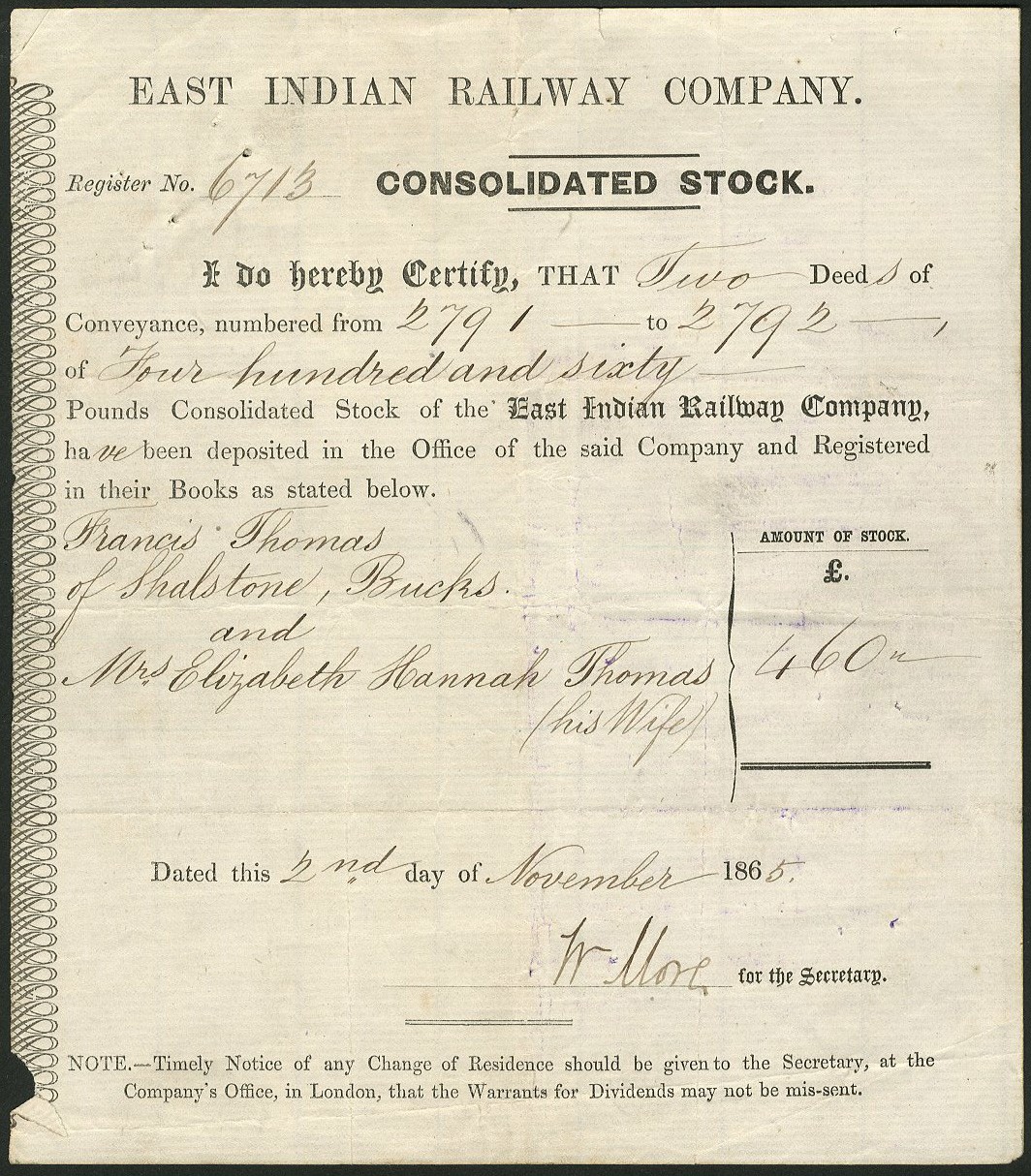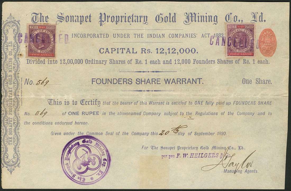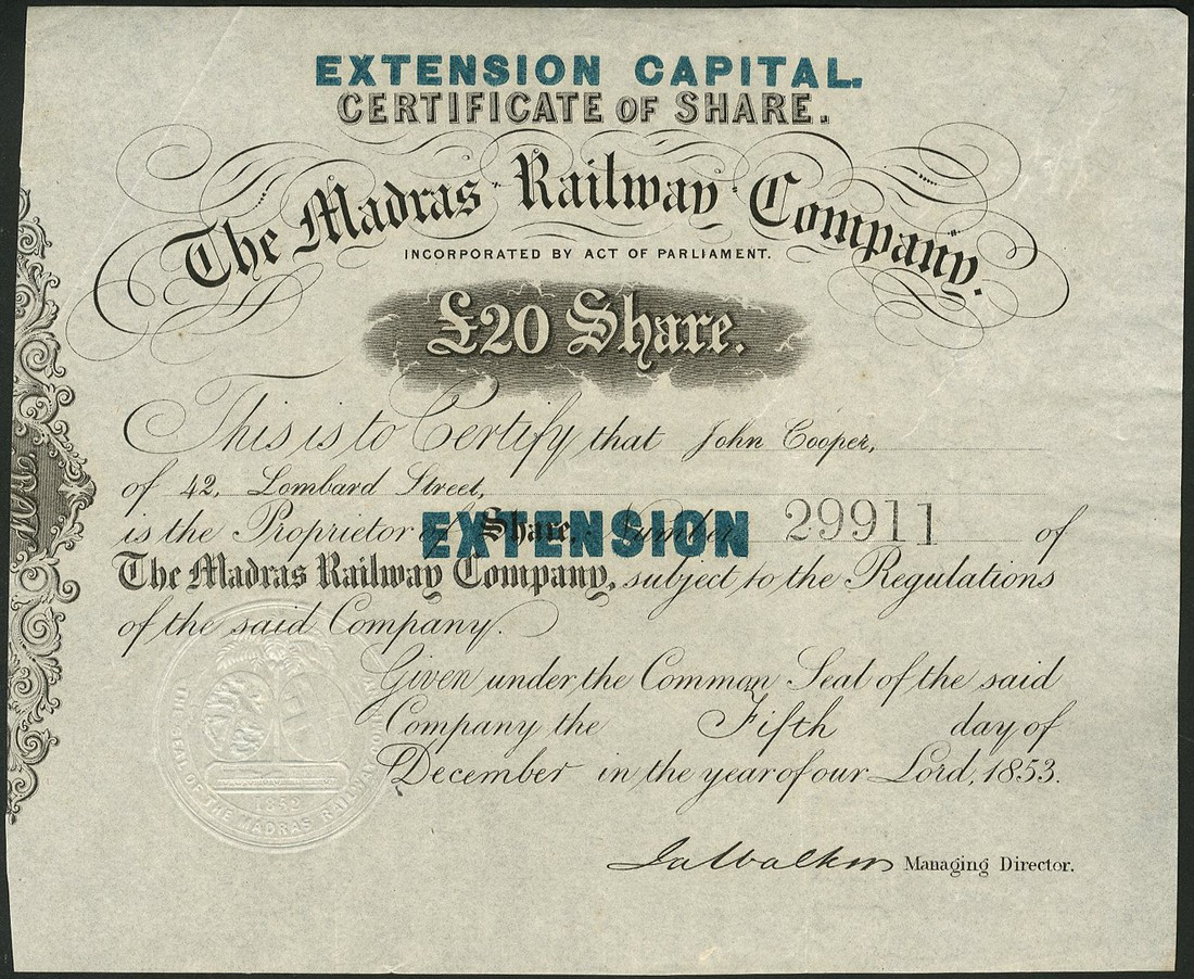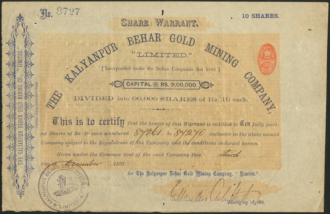 A small group of companies operating in India, comprising; Madras Railway Company, £20 share, 1853, extension of original capital, scrollwork at left, black; East Indian Railway Co., consolidated stock, 186[5], black; Bengal Gold & Silver Mining Co. Ltd., 100 shares of 1 rupee, 1890, black with yellow underprint; Sonapret Proprietary Gold Mining Co. Ltd., founders share, 1890, blue; Kalyanpur Behar Gold Mining Co. Ltd., 10 shares of 10 rupees each, 1891, blue with orange underprint; India General Navigation and Railway Co. Ltd., 5% debenture for 500 rupees, 1915, steamer on river at top, black and green, and Indian Iron and Steel Co. Ltd., 4% first mortgage debenture for £100, 19[37], foundry at top, green and black, generally very fine, the first and last slightly better. (7)