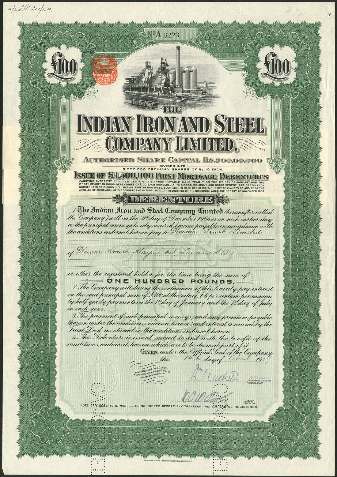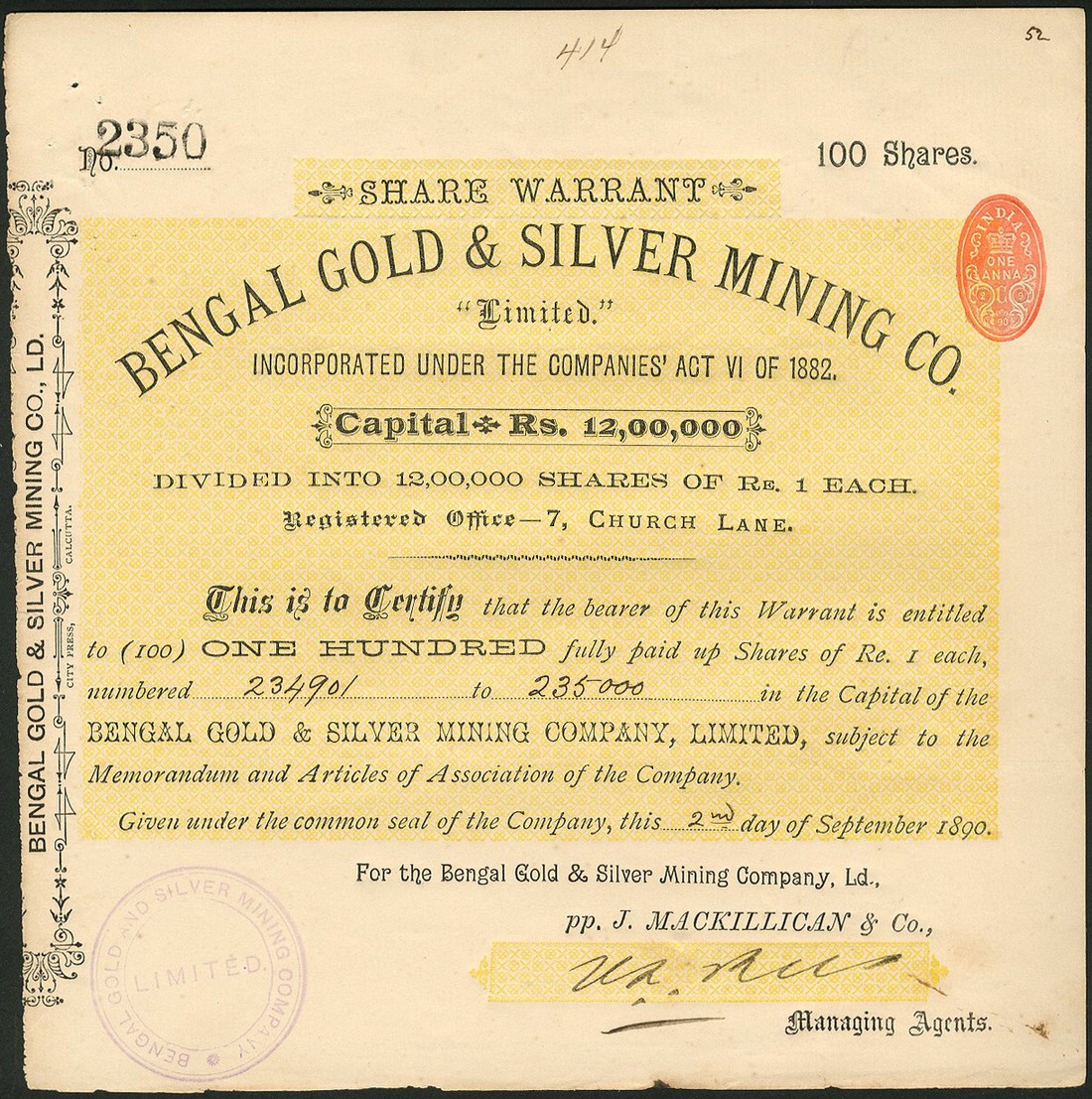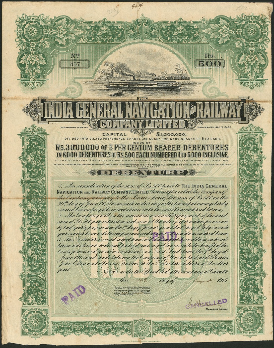 A small group of companies operating in India, comprising; Madras Railway Company, £20 share, 1853, extension of original capital, scrollwork at left, black; East Indian Railway Co., consolidated stock, 186[5], black; Bengal Gold & Silver Mining Co. Ltd., 100 shares of 1 rupee, 1890, black with yellow underprint; Sonapret Proprietary Gold Mining Co. Ltd., founders share, 1890, blue; Kalyanpur Behar Gold Mining Co. Ltd., 10 shares of 10 rupees each, 1891, blue with orange underprint; India General Navigation and Railway Co. Ltd., 5% debenture for 500 rupees, 1915, steamer on river at top, black and green, and Indian Iron and Steel Co. Ltd., 4% first mortgage debenture for £100, 19[37], foundry at top, green and black, generally very fine, the first and last slightly better. (7)