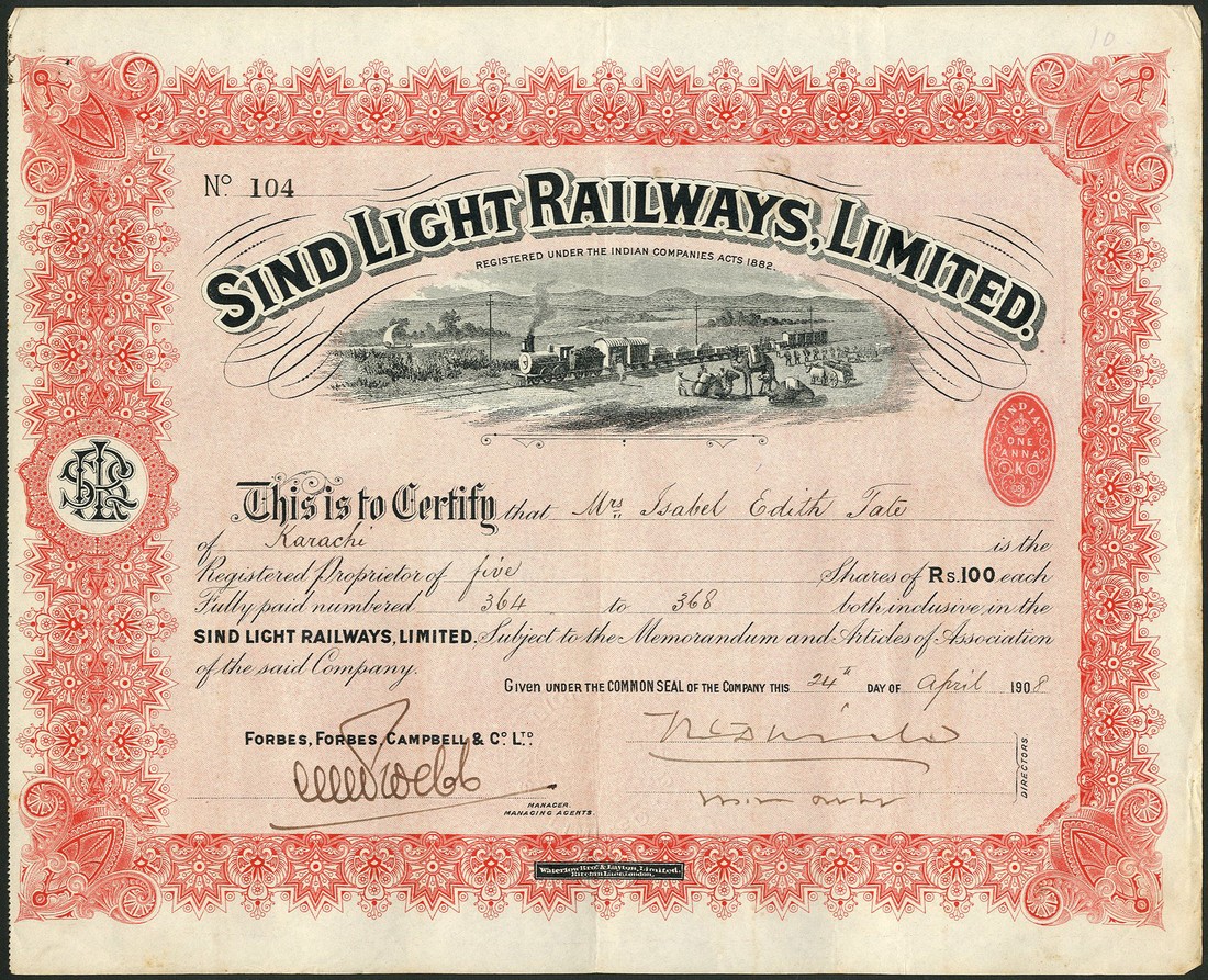Sind Light Railways Ltd., 100 rupee shares, 190[8], no.104, lovely vignette at top depicting steam train passing camel train with goods, ornate border, red and black, printed by Waterlow Bros & Layton Ltd., good very fine and rare