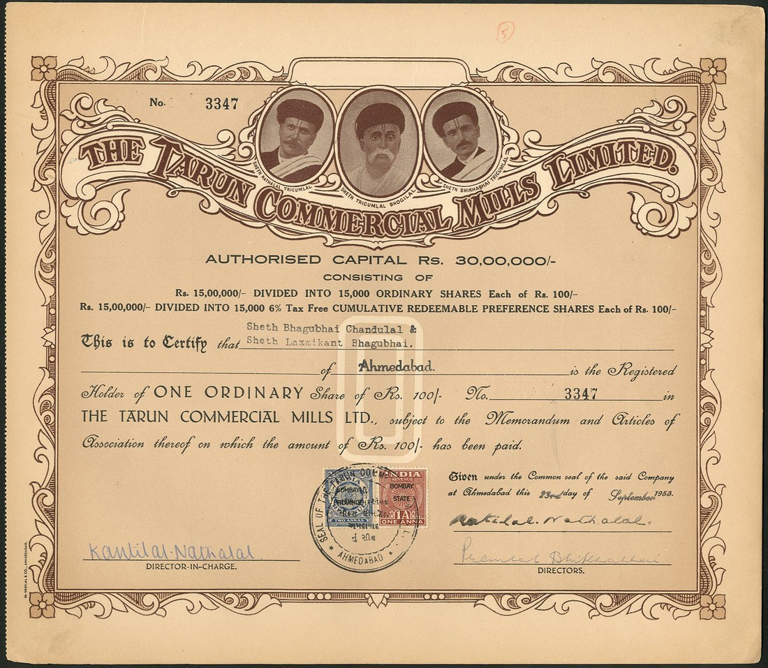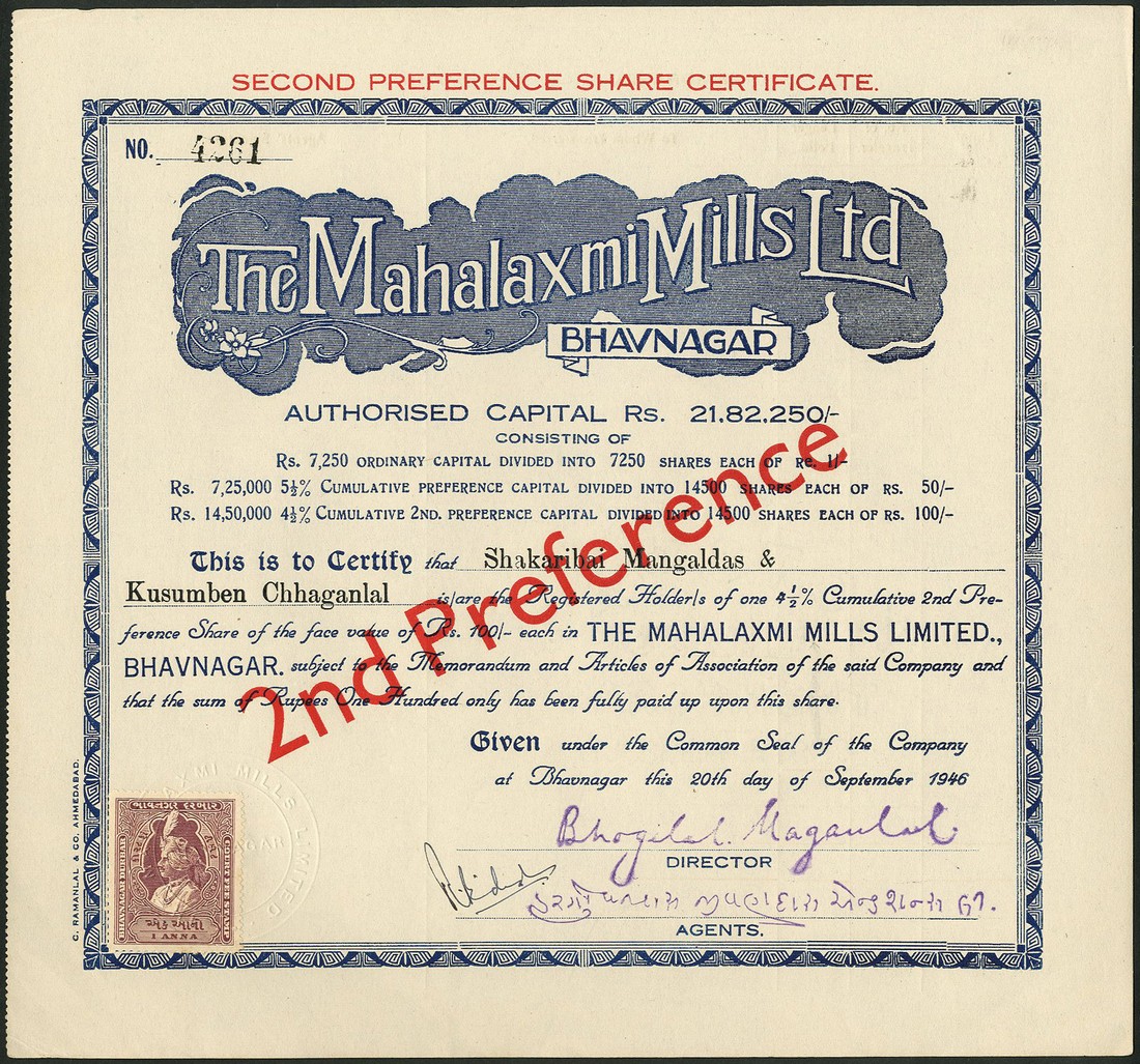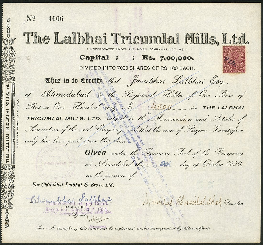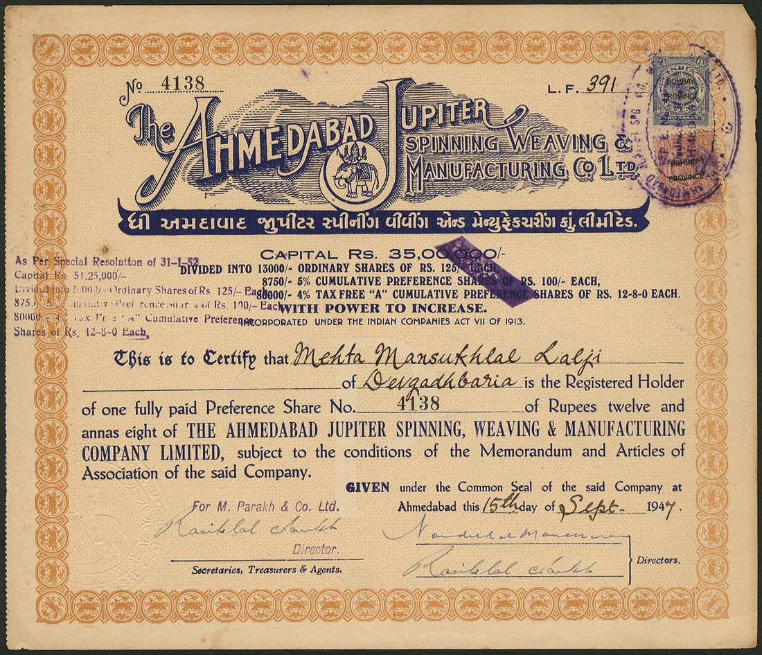 (x) An interesting group of textile mill companies comprising Tarun Commercial Mills Ltd., 100 rupee ordinary share, 1953, vignettes of three of the directors at top (10 examples); Ahmedabad JupiterSpinning, Weaving & Manufacturing Co. Ltd., 1947; Mafatlal Fine Spinning & Mfg. Co. Ltd., 1953; Howrah Mills Co. Ltd., 1903; Mahalaxmi Mills Ltd., Bhavnagar, 1946, this with scarce Bhavnagar Durbar adhesive revenue stamp; Kalyanmal Mills Ltd., 1922, with Holkar State adhesive revenue stamp; Lalbhai Tricumlal Mills Ltd., 1929, and, an unissued certificate in New Commercial Mills Co. Ltd., 192-, a few with vignettes, mixed condition but many very fine. (17)