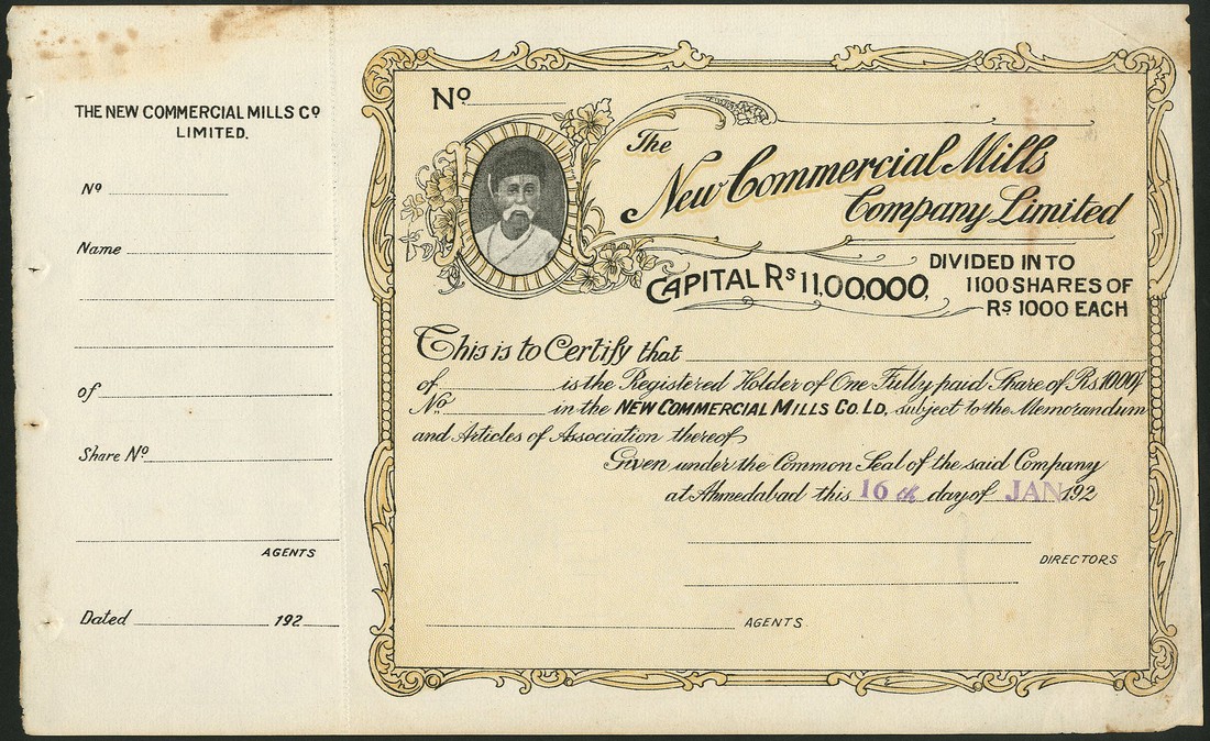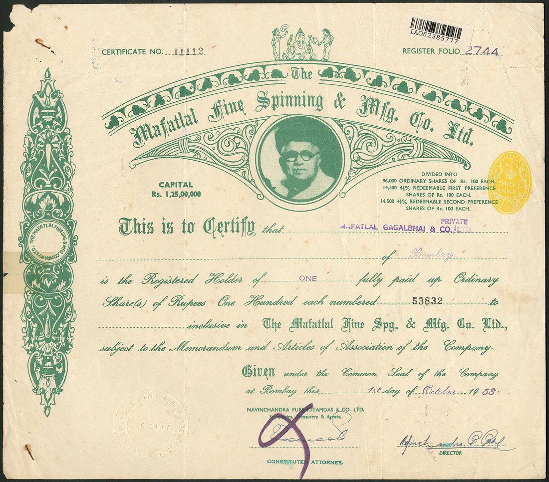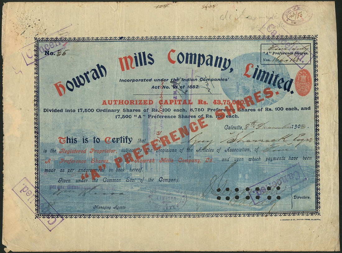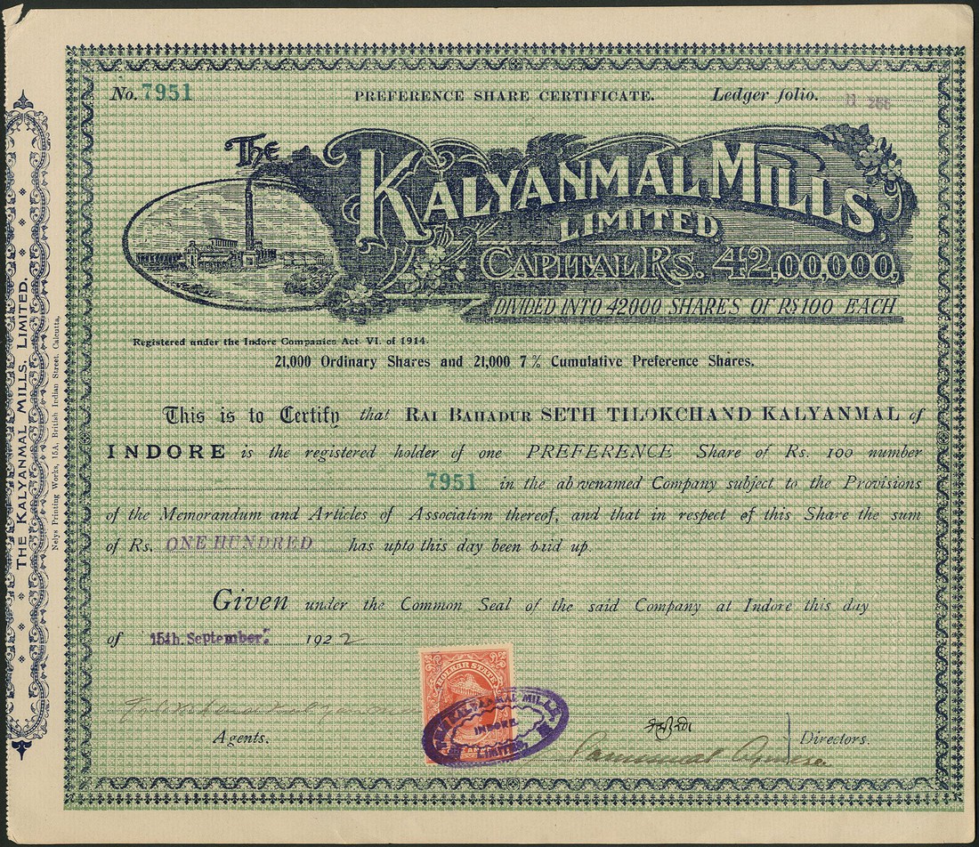 (x) An interesting group of textile mill companies comprising Tarun Commercial Mills Ltd., 100 rupee ordinary share, 1953, vignettes of three of the directors at top (10 examples); Ahmedabad JupiterSpinning, Weaving & Manufacturing Co. Ltd., 1947; Mafatlal Fine Spinning & Mfg. Co. Ltd., 1953; Howrah Mills Co. Ltd., 1903; Mahalaxmi Mills Ltd., Bhavnagar, 1946, this with scarce Bhavnagar Durbar adhesive revenue stamp; Kalyanmal Mills Ltd., 1922, with Holkar State adhesive revenue stamp; Lalbhai Tricumlal Mills Ltd., 1929, and, an unissued certificate in New Commercial Mills Co. Ltd., 192-, a few with vignettes, mixed condition but many very fine. (17)