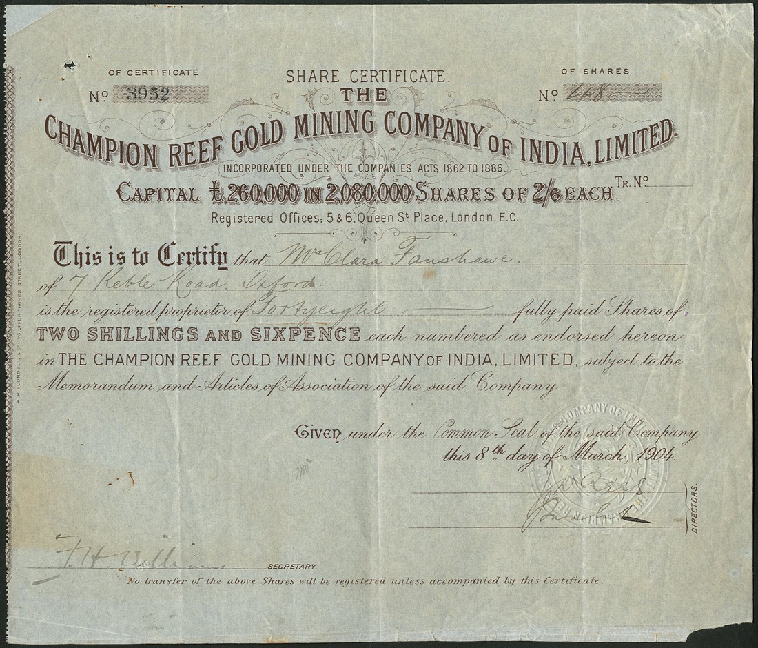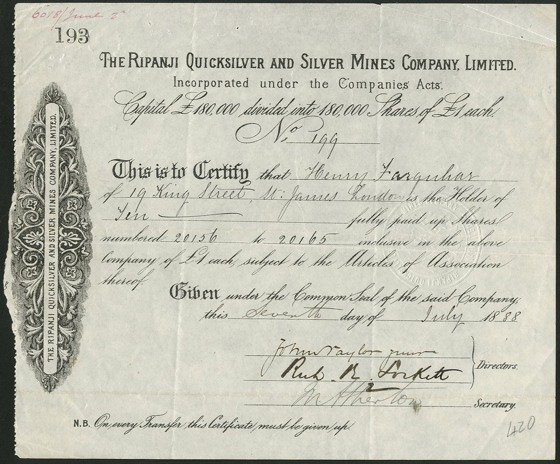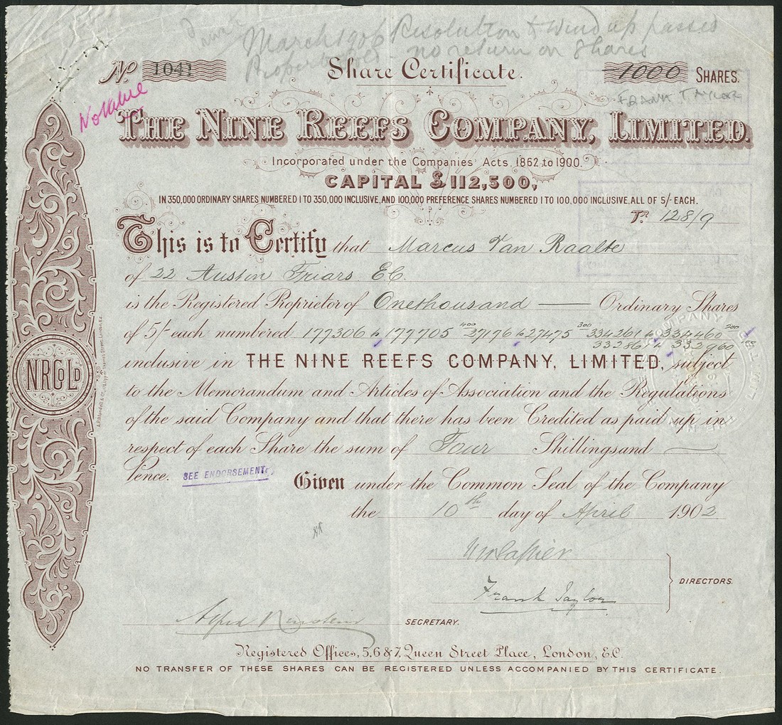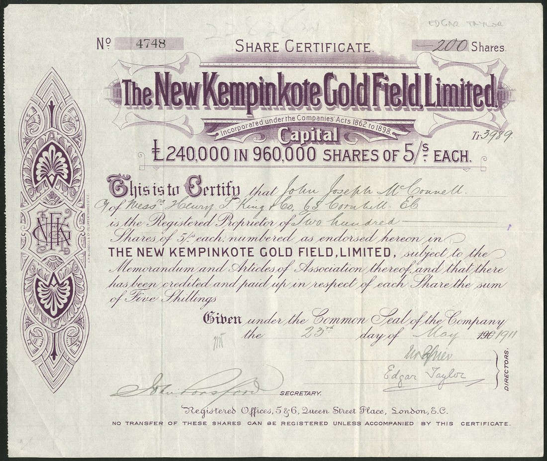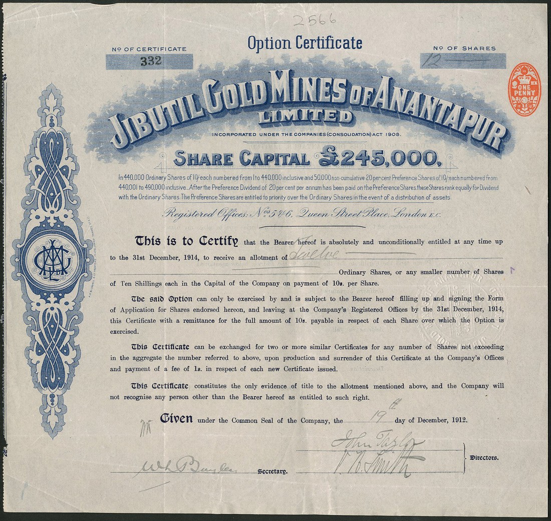 A group of Gold and Silver Mines in India, managed by John Taylor and Sons, comprising; Ripanji Quicksilver and Silver Mines Co. Ltd., £1 shares, fully paid, 18[88], signed by John Taylor jr., black; Champion Reef Gold Mining Co. of India Ltd., 2s6d shares, fully paid, 1904, brown on green paper; Nine Reefs Co. Ltd., 5/- shares, part paid, 190[2], signed by Frank Taylor, brown printing; Jibutil Gold Mines of Anantapur Ltd., option certificate for 10s shares, 1912, signed by John Taylor jr., blue, and New Kempinkote Gold Field Ltd., 5/- shares, 19[11], signed by Edgar Taylor, mauve, all very fine or thereabouts. (5)