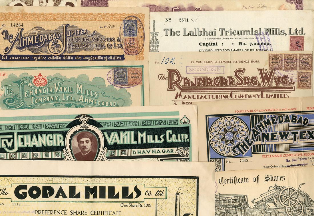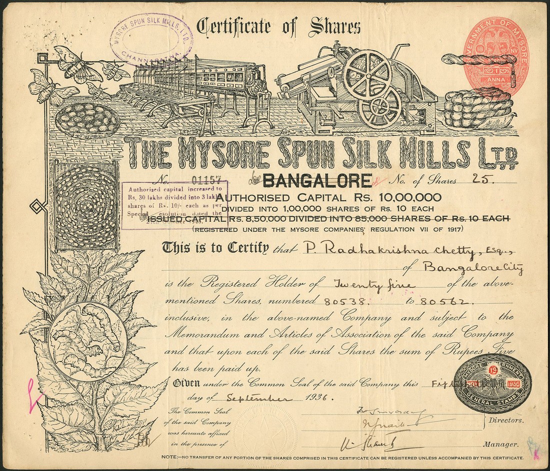 (x) A nice group of textile companies comprising Mysore Spun Silk Mills Ltd., 193[6], vignettes of silk worms, spun silk and spinning/weaving machinery, black, 2 impressed Mysore Government revenue stamps; Gopal Mills Co. Ltd., 1942; New Jehangir Vakil Mills Co. Ltd., 1943, vignette of the owner at top; Ahmedabad New Textile Mills Co. Ltd., 1947; Jehangir Vakil Mills Co. Ltd., 1948; Rajnagar Spinning, Weaving and Manufacturing Co. Ltd., 1943/4; Ahmedabad Jupiter Spinning Weaving & Manufacturing Co. Ltd., 1948; Lalbhai Tricumlal mills Ltd., 1929; Broach Fine Counts Spinning & Weaving Co. Ltd., 1918; Ahmedabad Ginning and Manufacturing Co. Ltd., 1920, and Megna Mills Co. Ltd., 1936, cancelled, many have attractive vignettes, a colourful lot, fine to very fine, several scarce. (11)