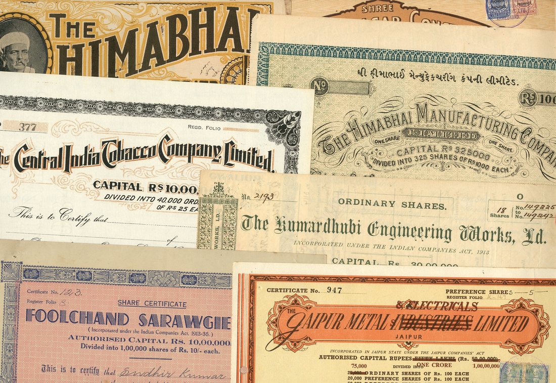 (x) Shree Purshottamnagar Construction & Development Ltd., a group of 10 certificates for 100 rupee shares, Ahmedabad 1947, godess in centre, company buildings at either side, brown and yellow, adhesive revenue stamps, together with Jaipur Metal & Electricals Ltd., 1944; Ivan Jones Ltd., 1941; Foolchand Sarawgie Ltd., 1950; Kumardhubi Engineering Works Ltd., 1919, cancelled, and unissued certificates in Himabhai Manufacturing Co. Ltd., 190- and another 19- and Central India Tobacco Co. Ltd., 193-, also three manuscript documents comprising a private bond between John Hughes, a veterinary surgeon and several natives, 1843, regarding a parcel of land in Bengal, a draft bill of sale, 1818 and an office copy of a court plea, Calcutta, 1818, the first almost extremely fine, the rest generally fine to very fine. (20)