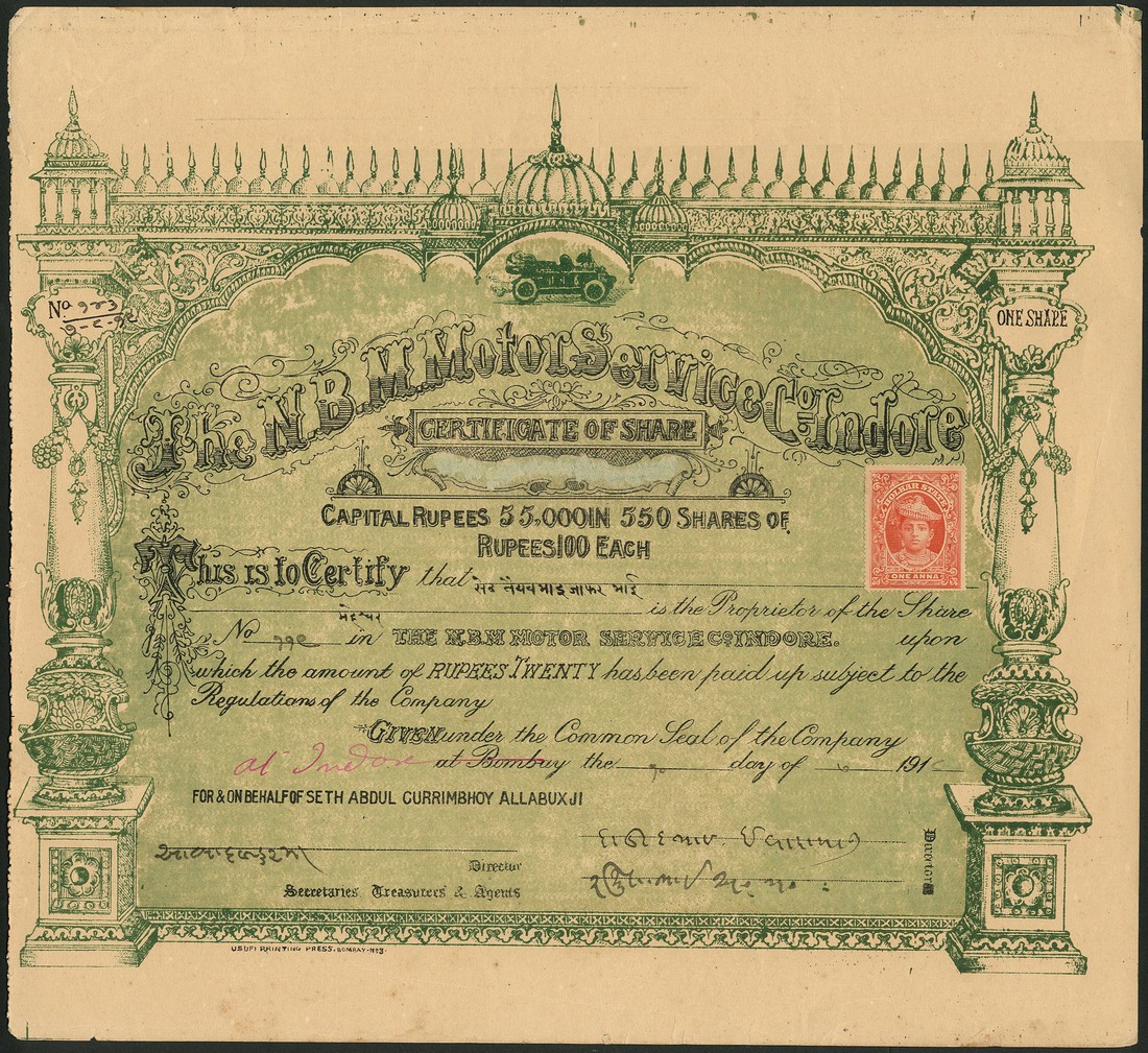 (x) N. B. M. Motor Service Co. Indore, 100 rupee share, Indore 191[6], an interesting piece with decorative architectural border, small motor car at top, green and black, small part of printing has been erased, adhesive revenue stamp on face, good very fine.