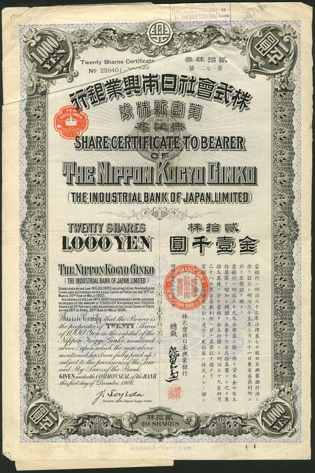 Nippon Kogyo Ginko (Industrial Bank of Japan Ltd.), bearer certificate for 20 shares of 50 yen, 1906, no.259401-259420, ornate border, black with blue underprint, full text in Japanese and English, with coupons, very fine.