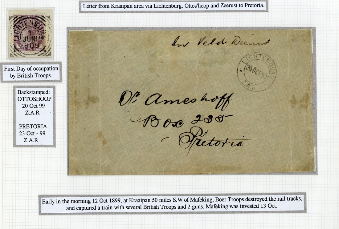 1899 (20 Oct.) "In Veld Dienst" envelope (two vertical creases) from the Kraaipan area to Pretoria, showing Lichtenburg double-ring datestamp on face, Ottoshoop (20.10) and arrival (23.10) c.d.s. on reverse; also G.B. 1d. lilac on piece with Lichtenburg squared-circle datestamp (1.6.00, the first day of occupation by British troops)