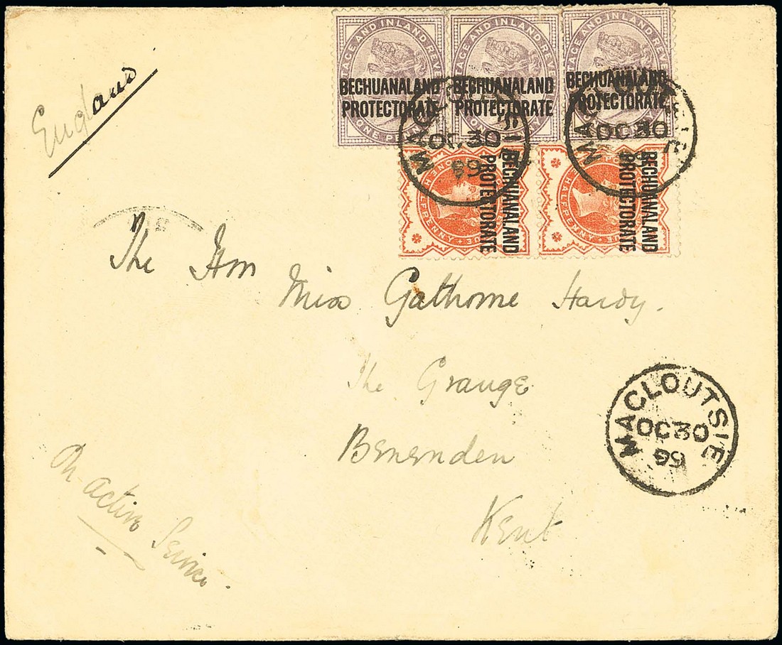 1899 (30 Oct.) envelope "On Active Service" from Macloutsi, Bechuanaland, to England, bearing 1897 ½d. (2) and 1d. (3) twice cancelled by c.d.s. with a further strike below, the reverse with Palapye (2.11), Bulawayo (5.11) and Durban (6.12) c.d.s.; the adhesives with a few faults though a rare and spectacular franking. The earliest recorded Rhodesian Force mail out of Bechuanaland during the first month of the war. Photo