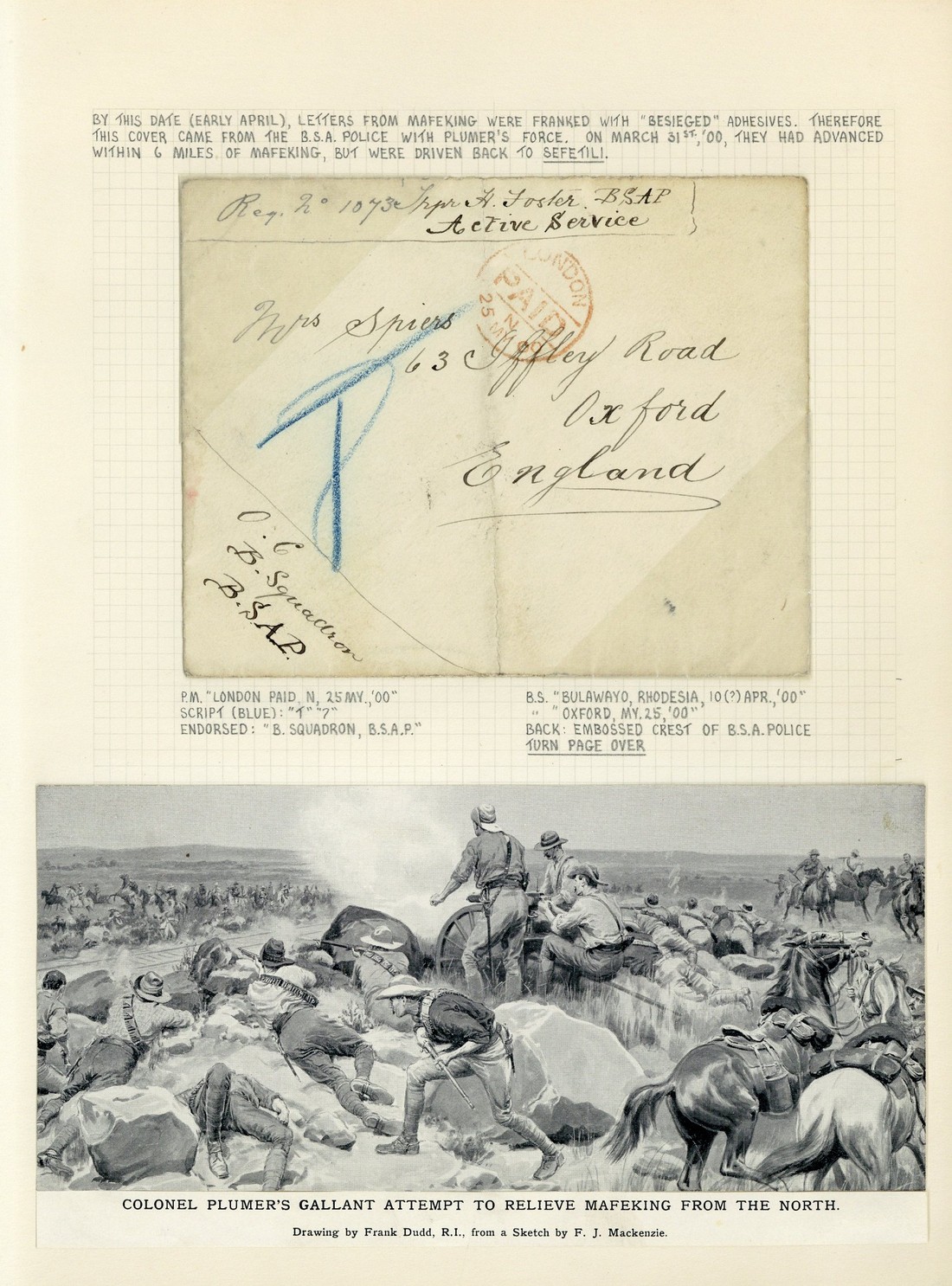 1900 (Feb. and May) unstamped soldier's envelopes from members of the B.S.A.P., probably with Col. Plumer's Force advancing on Mafeking, the first countersigned by a Captain and showing "T" handstamp deleted in London and London Paid c.d.s. (1.4) on face, , Bulawayo (14.2) and Colchester (2.4) c.d.s. on reverse, the second from "Reg No. 1073 Trpr H Foster BSAP Active Service" and countersigned by the Officer Commanding B Squadron, deleted manuscript "T"P> mark and London Paid c.d.s. (25.5) on face, Bulawayo (10.4) and Oxford (25.5) c.d.s. on reverse; an interesting pair. Also 1899 letter from East London with "We have no news from Mafeking, only that Col. Plumers relief column has arrived there from the north which is good news"