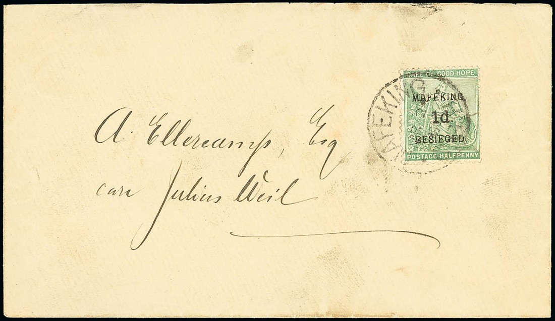1900 (24 Mar.) envelope to "A Ellerecamp Esq. care of Julius Weil", bearing seriffed type Cape 1d. on ½d. green (Hope seated) Type 3, with c.d.s.; a couple of trivial imperfections though fine for these scarce items and posted only one day after issue. S.G. 1. Photo
