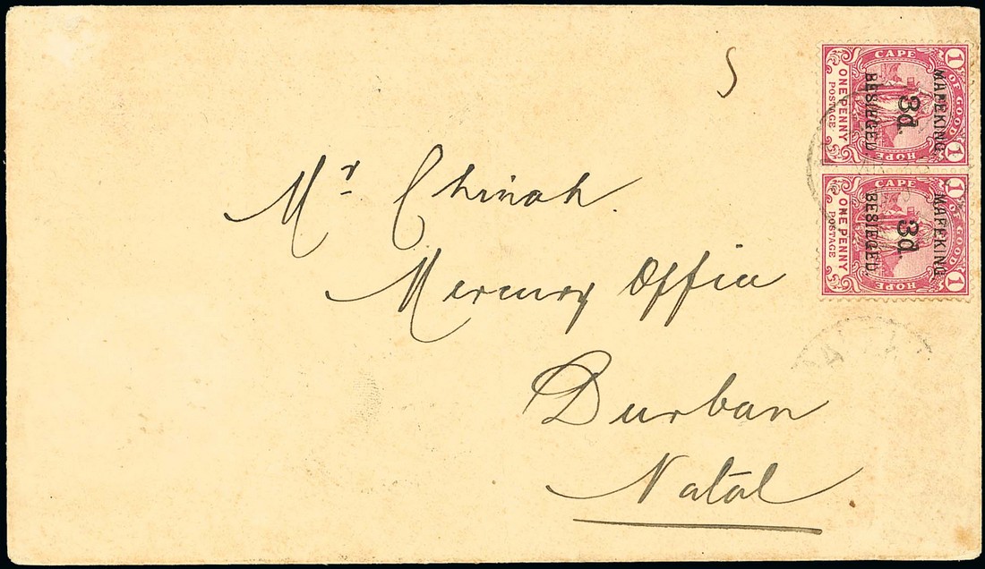 1900 (26 Mar.) envelope to Durban, bearing seriffed overprint Cape 3d. on 1d. carmine horizontal pair, Types 2-3, lightly cancelled and tied, the reverse with Barkly West (11.4), Kimberley (12.4) and Durban c.d.s.; vertical fold at centre. One of the few covers known to Natal. S.G. 3. Photo