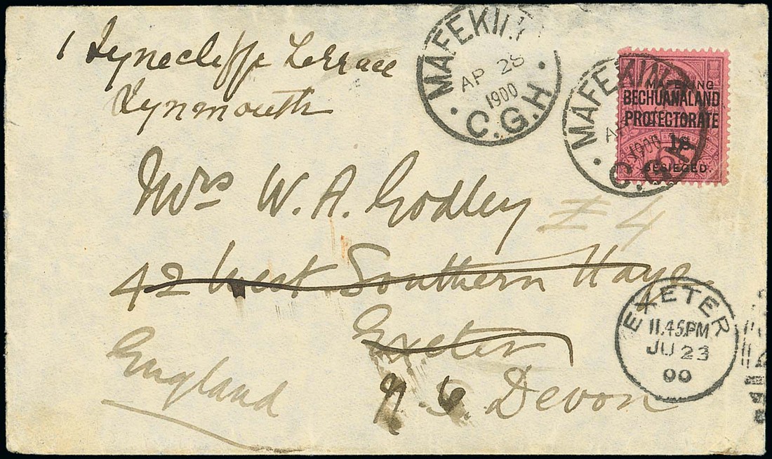 1900 (28 Apr.) envelope ex the Godley correspondence to Exeter and redirected to Lynmouth, bearing sans-seriffed Bechuanaland Protectorate 1/- on 6d. purple on rose-red (crease at lower right corner) neatly cancelled with a further strike alongside, part Exeter duplex (23.6) below, the reverse with Bulawayo (6.5 with "mei" Dutch spelling for month), Exeter (23.6) and Barnstaple (24.6) c.d.s. Rare with few sans-seriffed printings recorded, particularly on non-philatelic frankings. Brandon Certificate (1980). S.G. 14. Photo