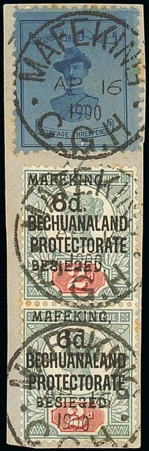 Pale blue used with seriffed surcharge Bechuanaland Protectorate 6d. on 2d. green and carmine Type 4 vertical pair, each neatly cancelled by 16 April c.d.s. and tied to backed piece; a few light fox marks in places and 3d. with a couple of short perfs. S.G. 8, 19, £715. Photo