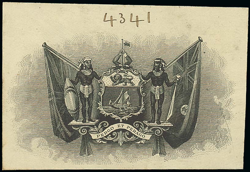 Large Arms of the company with additional flags both sides, unframed (67mm x 46mm), manuscript die number "4341" below, fine. Photo