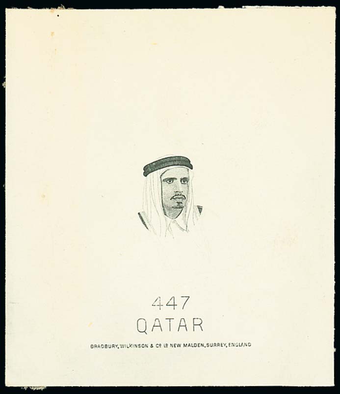 1961 Shaikh Ahmad bin Ali al-Thani head unframed (57mm x 65mm), similar to issued 1r. to 10r., die number "447" and "qatar" below, fine. Photo
