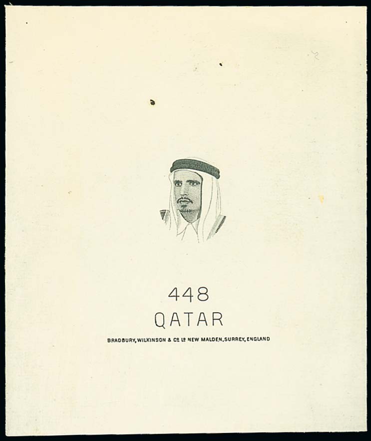 1961 Shaikh Ahmad bin Ali al-Thani head unframed (61mm x 72mm), die number "448" and "qatar" below, slight soiling otherwise fine. Photo